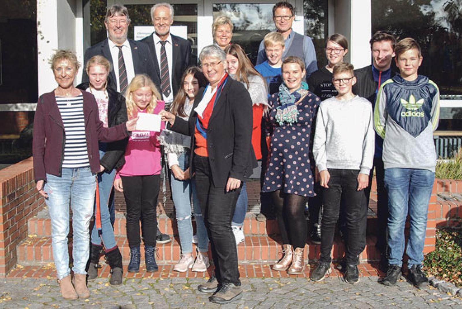 500 Euro hat der Deutsch-Französische Freundeskreis gestern an die Oberschule Weener gespendet. Im Bild vorne links Französisch-Lehrerin Amke Boelsen, hinter ihr von links Helmer Buntjer sowie Albert und Annegret Woldenga vom Freundeskreis, neben ihnen Schulleiter Dirk Kaiser. Die Spende ü...