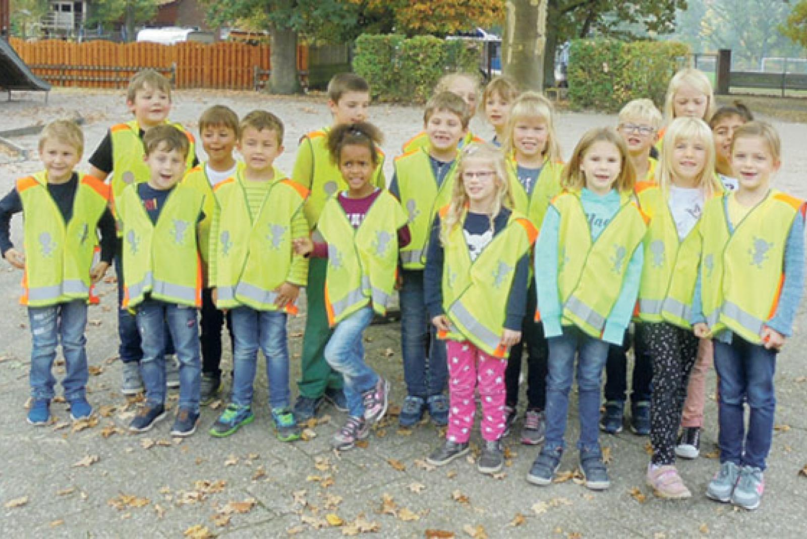 Gut sichtbar im Verkehr: An der Sicherheitsaktion der ADAC-Stiftung nehmen auch die Erstklässler der Grundschule Möhlenwarf unter der Leitung von Lehrerin Bärbel Zoschke teil.