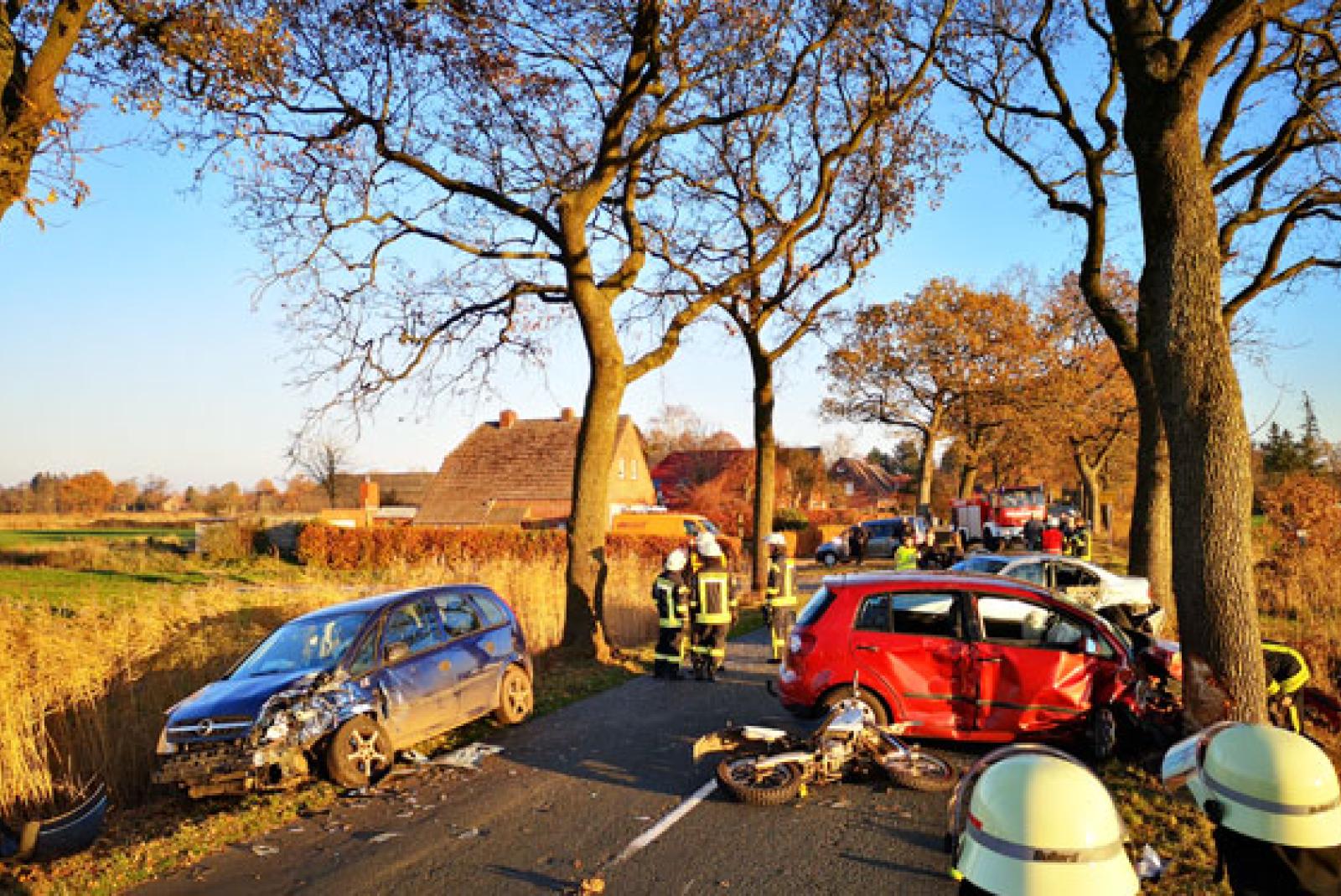 Bei einem schweren Verkehrsunfall in Theene (Südbrookmerland) sind am Samstag gegen 14.45 Uhr zehn Menschen verletzt worden.