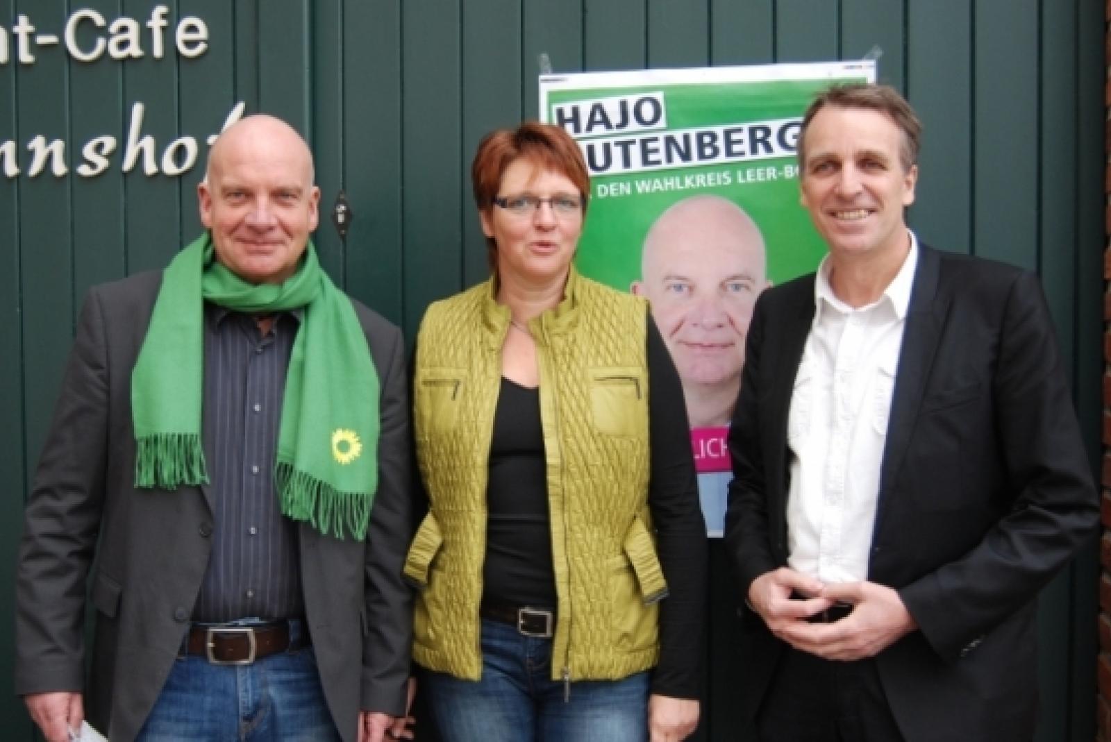 »Der doppelte Rutenberg«: Hajo Rutenberg lächelt auf diesem?Foto im Hintergrund auch noch von seinem?Wahlplakat. Gestern begrüßte er nicht nur die grüne Landtagsabgeordnete Meta Janssen-Kucz in Bunde, sondern auch den Spitzenkandidaten Stefan Wenzel. © Hoegen