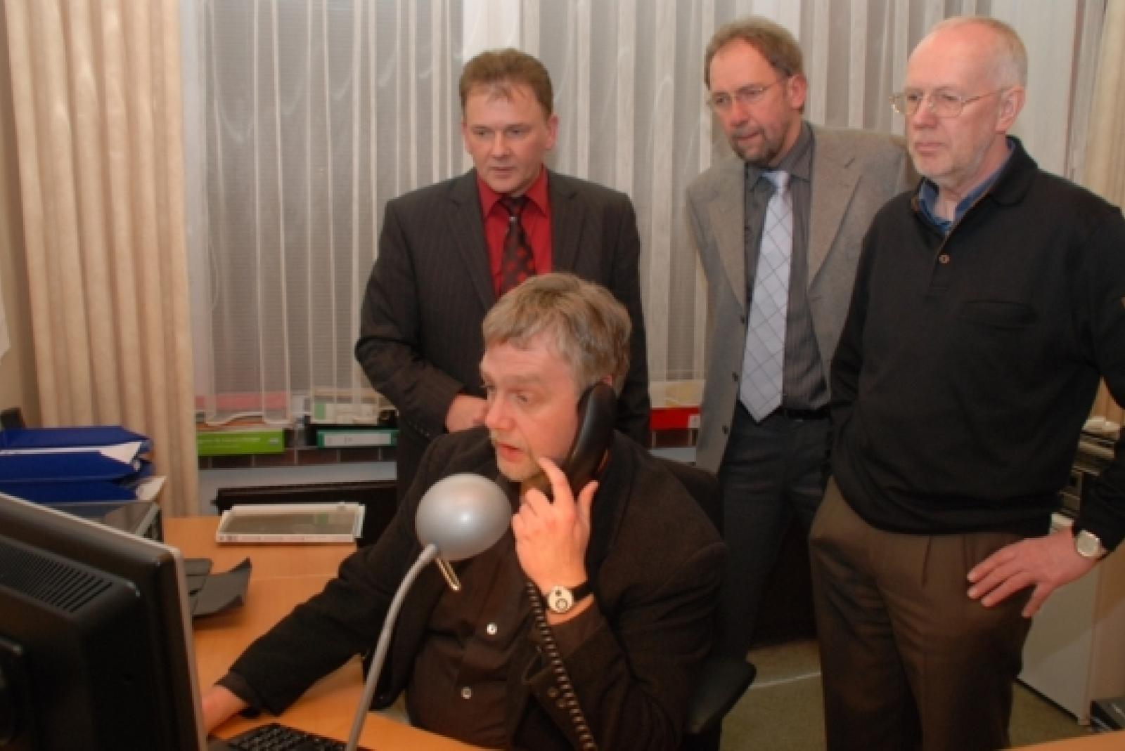 Gespannt verfolgen Bürgermeister Gerald Sap, Fachbereichsleiter Harm Watermülder und Saps Allgemeiner Stellvertreter Werner Popken (von links) nach der Landtagswahl am 27. Januar 2008 die ersten Ergebnisse aus der Gemeinde Bunde. Am Telefon:?Jan-Martin Donker.  © Archivfoto: Hanken