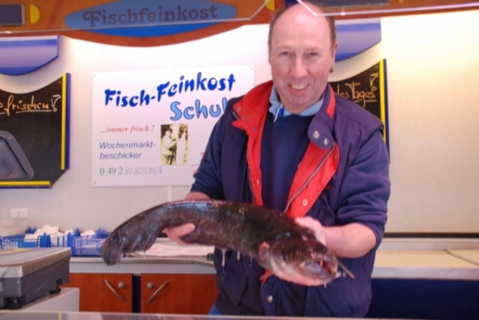 Einen kapitalen Wels präsentiert hier Fischhändler Hans-Werner Schulz aus Pewsum, der jetzt auch den?Wochenmarkt in?Bunde jeden Donnerstag besucht. © Hoegen