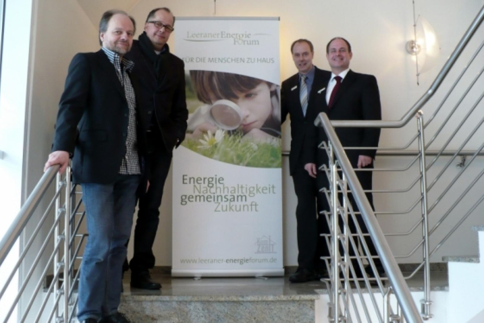 Laden ein zum 7. Leeraner Energieforum am 2. und 3.?Februar:?(von links) Oliver Gassner (KomZeniT), Wolfgang Schneider (Werbeagentur Schneider), Karsten Rinne und Matthias Joppe (beide Sparkasse LeerWittmund). © privat