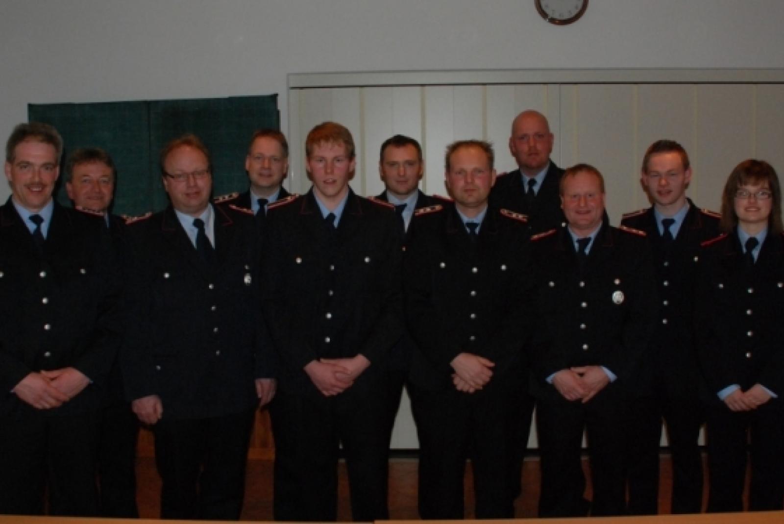 Gewählt, befördert oder »zum Schnuppern aufgenommen« wurden (von links) Tobias Stirler (neuer Ortsbrandmeister und Oberlöschmeister), Helmut Steinfelder (Stellvertreter), Achim Klinkenborg (Kassierer und Schriftführer), Holger Bross (Gerätewart), Martin Beekmann (Gerätewart und befördert zum Oberfeuerwehrmann), Matthias Lauts (Atemschutzbeauftragter), Jens Battermann (Sicherheitsbeauftragter), Frank Leemhuis (Kleiderwart), Harald van Lessen (Beisitzer Ortskommando), Timo Klinkenborg (Beisitzer Ortskommando und befördert zum Oberfeuerwehrmann) und Heike Stirler (probeweise).  © Kuper