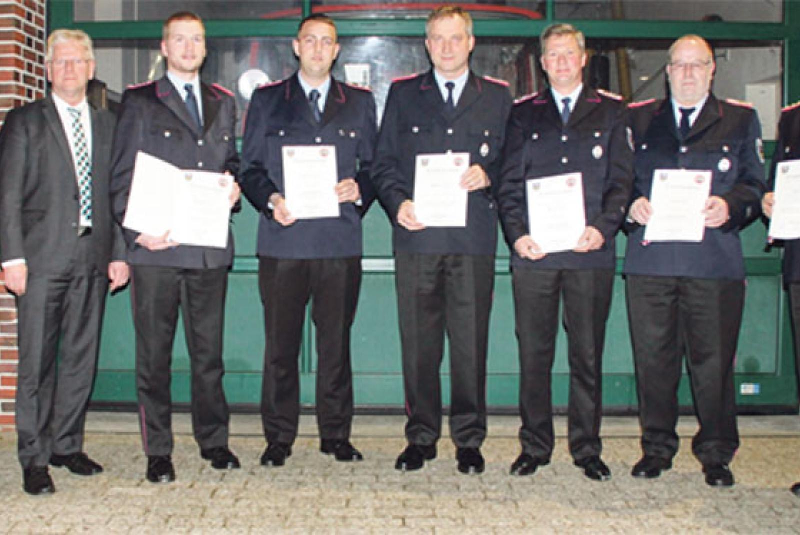Im Rahmen der Sitzung des Stadtkommandos im Feuerwehrhaus in Weenermoor hat Bürgermeister Ludwig Sonnenberg jetzt den Stadtbrandmeister Jörg Fisser und seinen Vertreter Gerhard Kuper, die Ortsbrandmeister Wilhelm Heijen (Weenermoor) und Klaas-Enno Haken (Vellage) sowie deren Stellvertreter Ingo Janssen (...