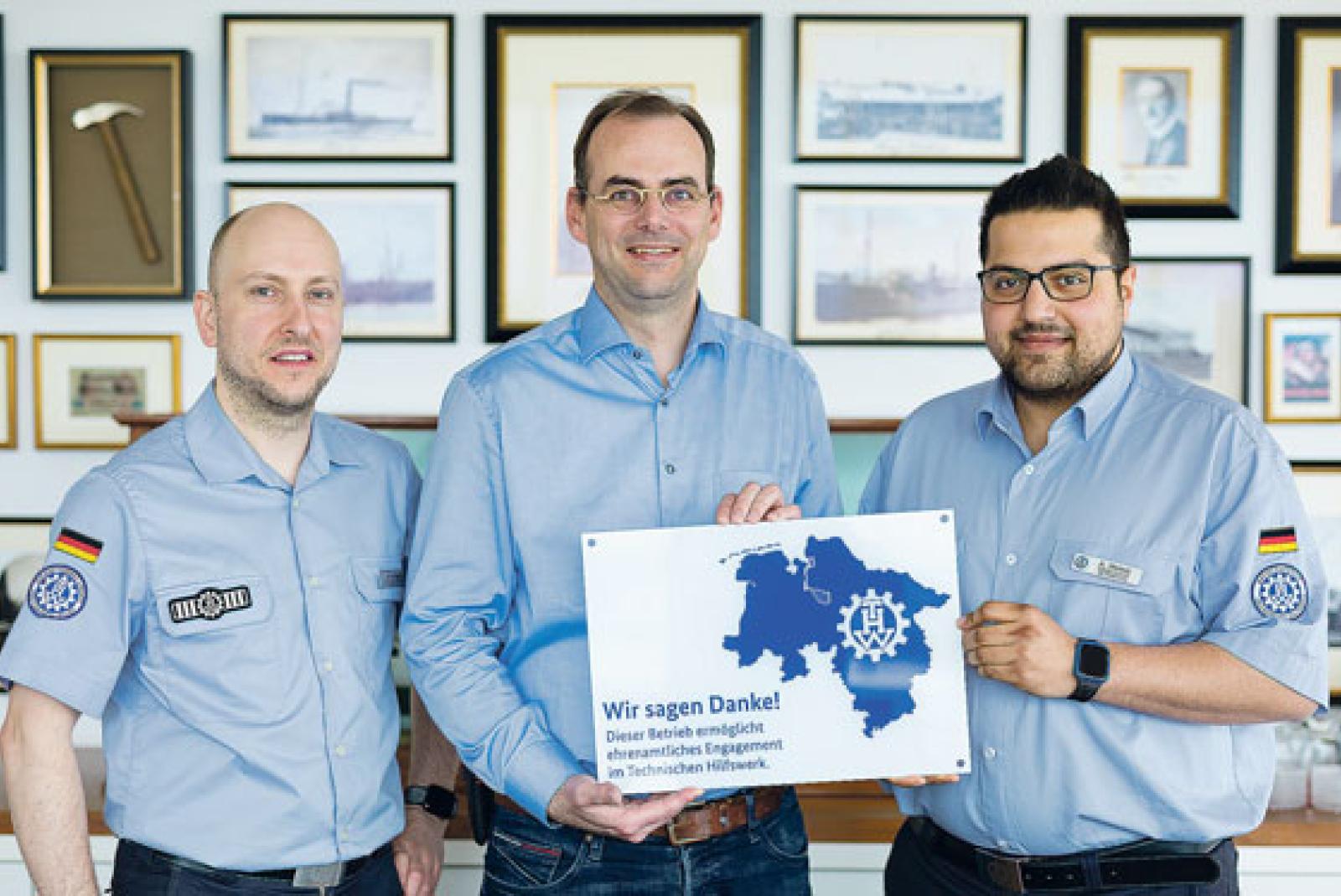Der Ortsbeauftragte Ali Etemaj und sein Stellvertreter Marco Röttgers vom Technischen Hilfswerk (THW) Ortsverband Papenburg haben in Abstimmung mit dem THW-Ortsverband Leer ein Dankesschild an die Meyer Werft überreicht. Geschäftsführer Thomas Weigend (Mitte) nahm es entgegen. Es ...