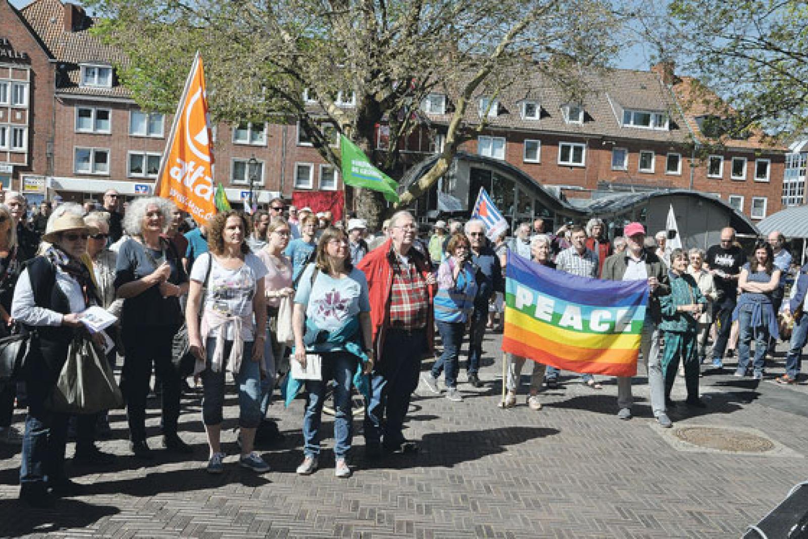 Der Wind, der gestern um 12.15 Uhr im Stadtgarten den Teilnehmern des Ostermarsches kurzzeitig kräftig um die Ohren blies, könnte durchaus symbolisch für den Protestzug stehen, der sich gestern Mittag durch Emden schob.