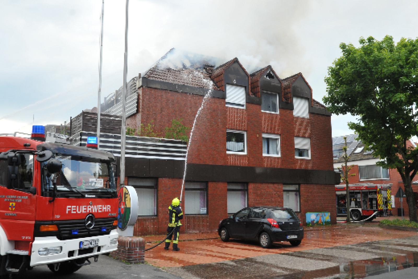 Für die Aschendorfer Feuerwehr dürfte es eine der kürzesten Anfahrten ihrer Einsatzgeschichte sein. Das Gebäude steht direkt neben dem Feuerwehrhaus. Einen Teil der Löscharbeiten absolvieren sie von dessen Dach aus.