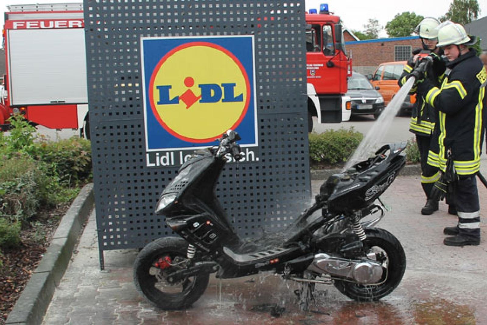 Auf dem Parkplatz des Discounters »Lidl« an der Mühlenstraße in Weener ist heute Nachmittag ein abgestellter Motorroller in Brand geraten.