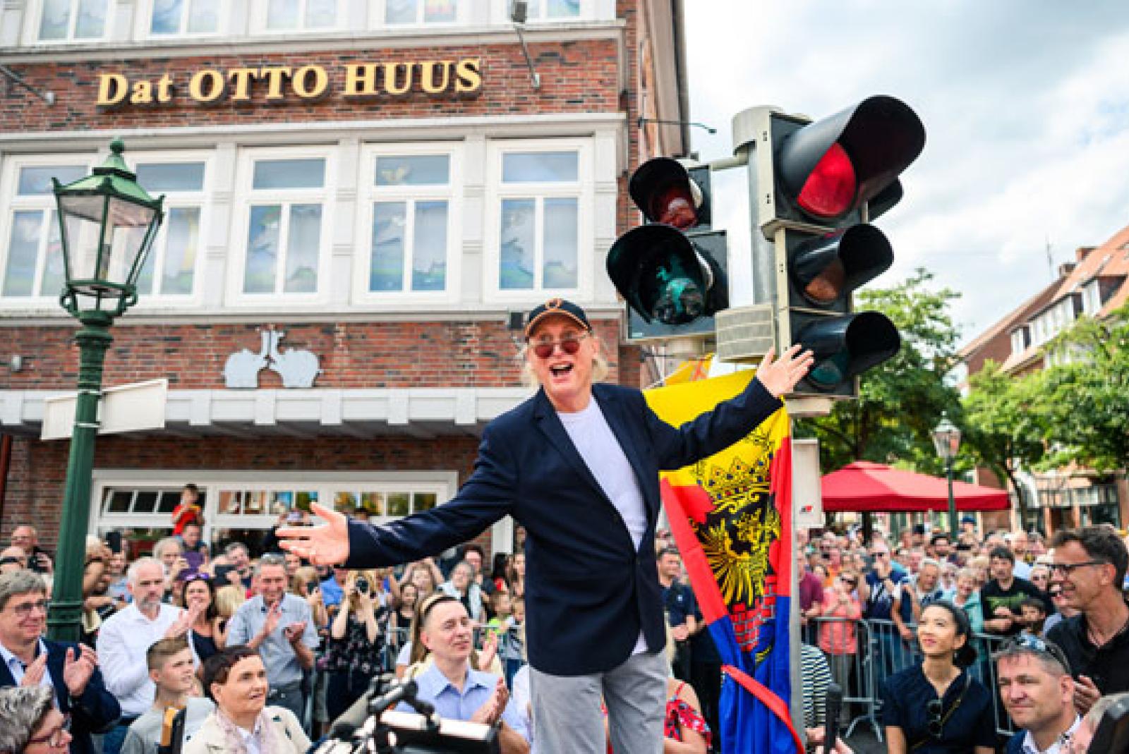 Otto Waalkes hat am Sonnabend in seiner Geburtsstadt Emden vor Hunderten Menschen die erste von vier »Otto-Ampeln« enthüllt. Ein hüpfender grüner Otto zeigt nun an, ob die Straße gefahrlos überquert werden kann.