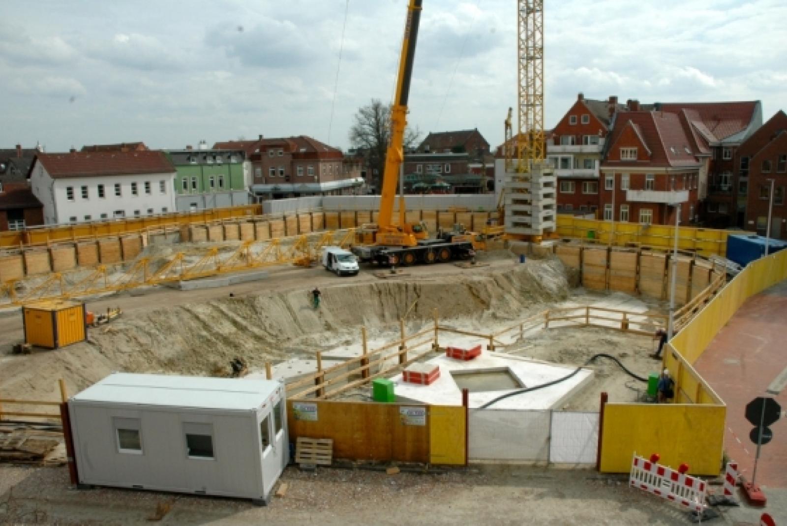 Die größte Baustelle der Ledastadt: Der Abbruch der Hauptstelle der Sparkasse Leer Wittmund ist vollendet, der Neubau hat begonnen. Seit Montag wird auch die Containerwand auf dem Denkmalsplatz - auf unserem Bild hinter dem Autokran - abgebaut. © Szyska