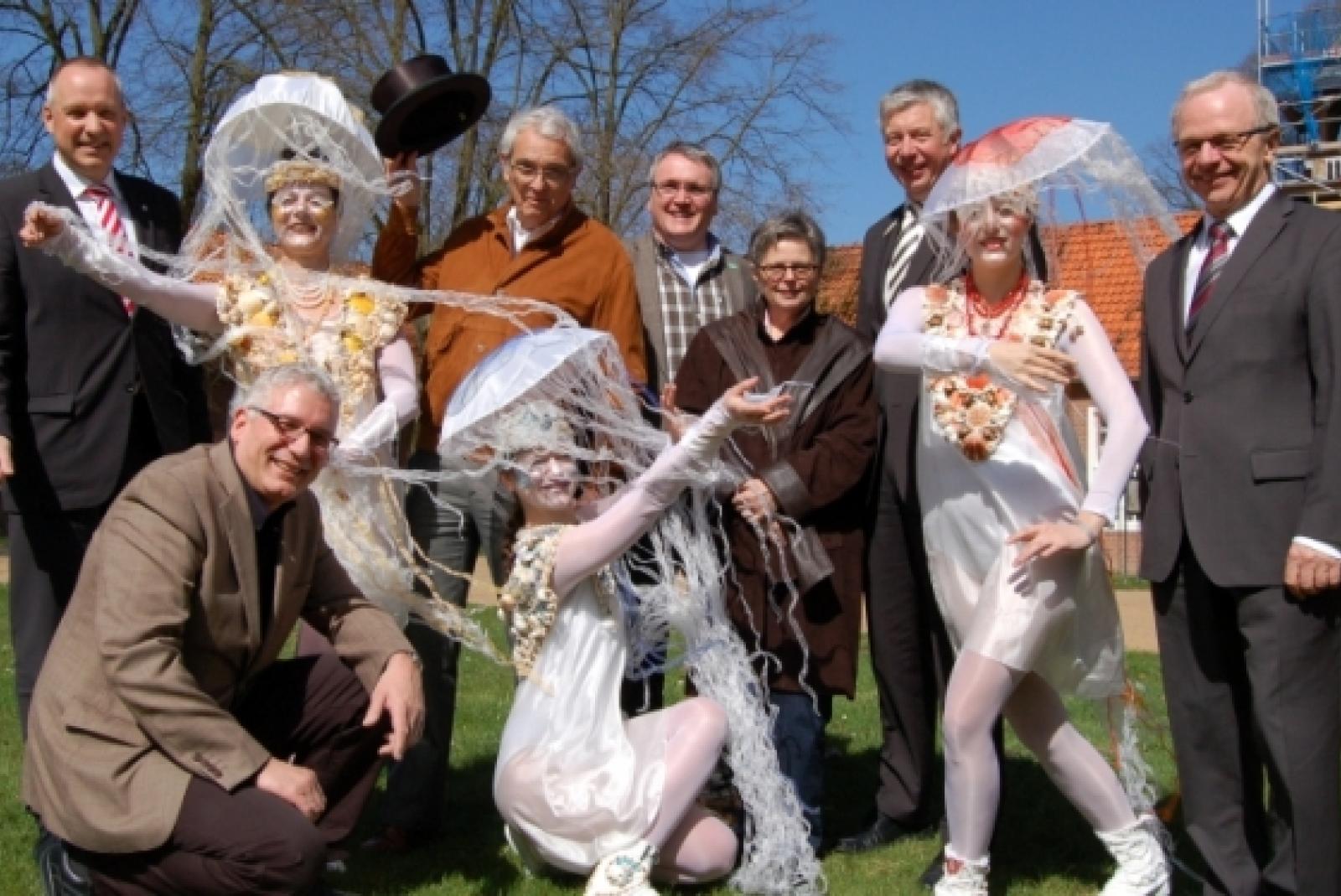 Drei Medusen und die »Fäden-Zieher« hinter der Kulisse des »Kleinen Festes«: (hinten von links) Thomas Romaneeßen von der Ostfriesischen Brandkasse, Harald Böhlmann, Kurt Radtke, Geschäftsführer der Touristik GmbH Südliches Ostfriesland, Ghita Cleri, Heinz Feldmann von der Sparkasse LeerWittmund, Bernhard Bramlage sowie (vorne) Conrad Lübbers. © Nagel