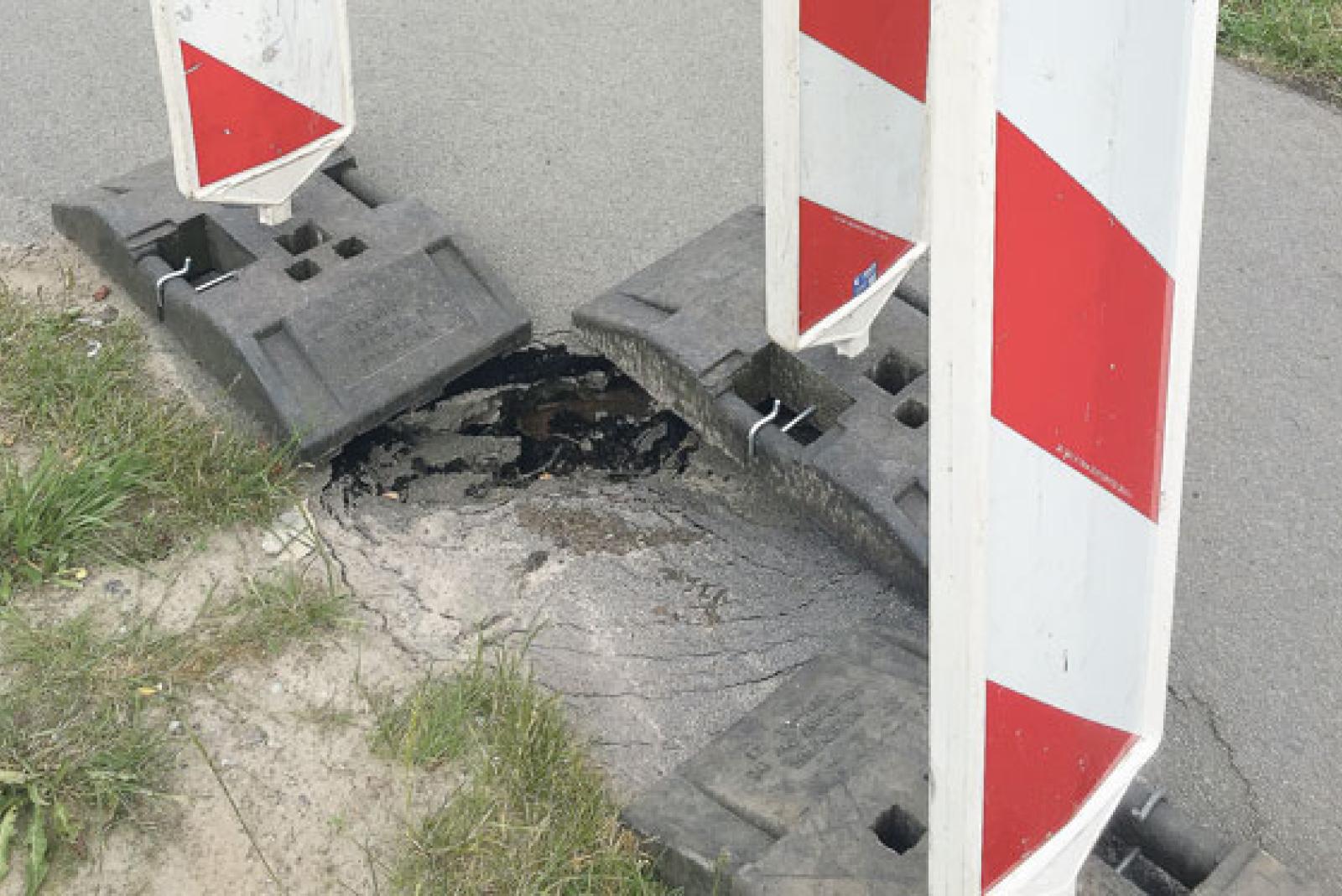 Auf dem Fahrrad- und Fußweg am Kreisel in Weener ist ein tiefes Loch im Asphalt entstanden. Die Stadt forscht seit über einer Woche nach der Ursache.