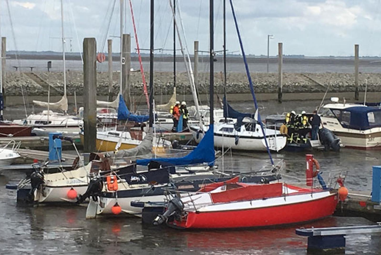 Feuerwehr im Sportboothafen von Juist mit Großaufgebot im Einsatz