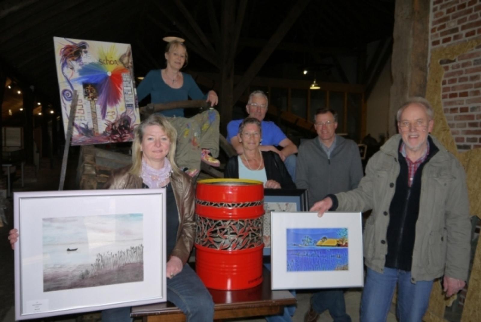 Setzten bereits am Dienstagabend ihre Werke ins rechte Licht – die Künstler der 4. DollArt-Ausstellung: (von links) Sabine Baudner, Hildegard Sjoukje, Katharina Horn, Uken, Dieter Hunken, Karl Heinz Davids und Hinderk Smidt. © Foto: Himstedt