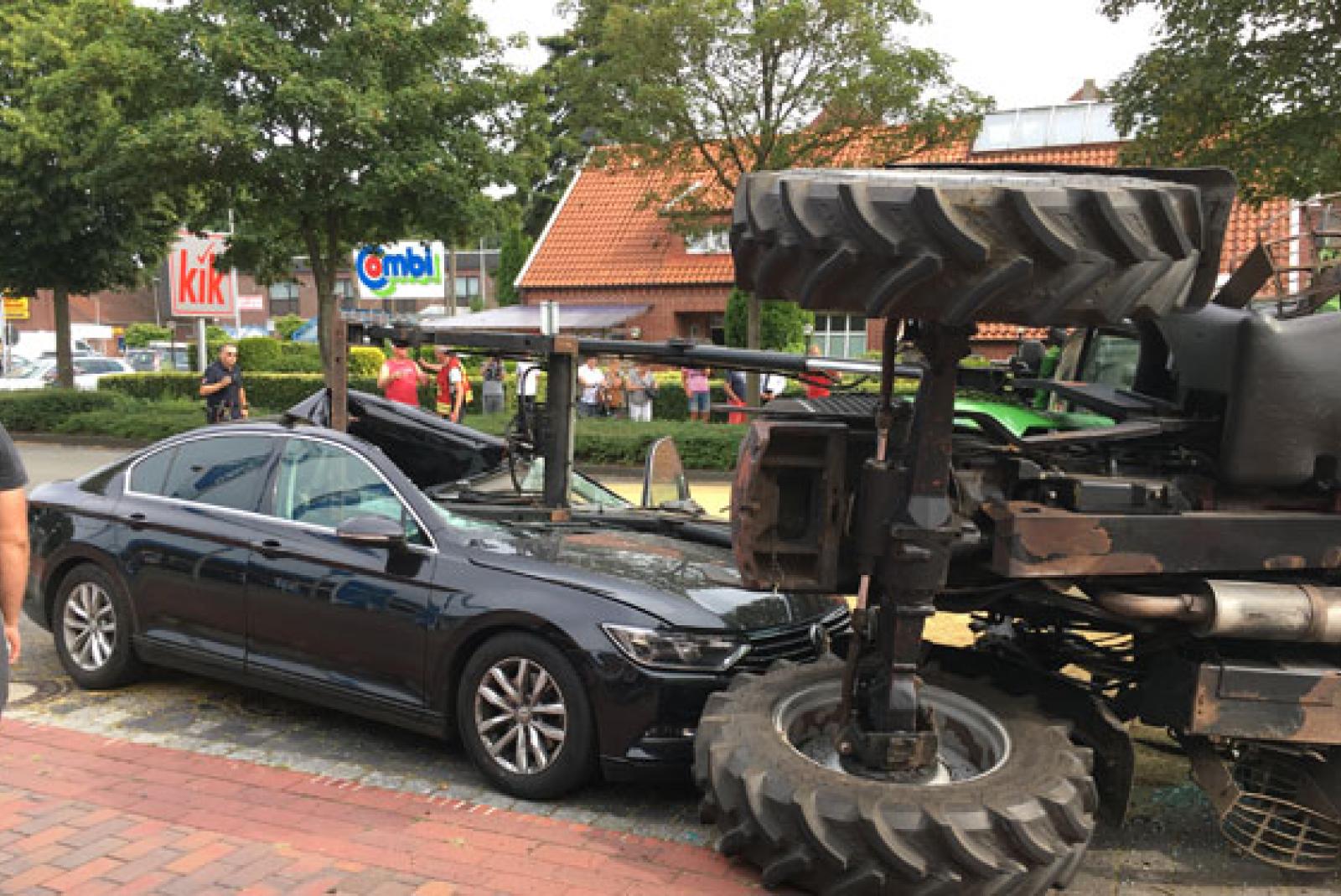 Zu dem Unfall kam es gegen 16.50 Uhr auf der Ostertorstraße. der 46-jährige Mann aus Weener befuhr mit einem Trecker, an dem ein Anhänger gekoppelt war, die Ostertorstraße in Richtung Großsander. Aus bislang ungeklärter Ursache geriet das Treckergespann, welches mit Getreide beladen war, ins Schleudern und kippte auf die Seite. Dabei durchschlug der Frontlader die Frontscheibe eines am Fahrbahnrand geparkten VW Passat.