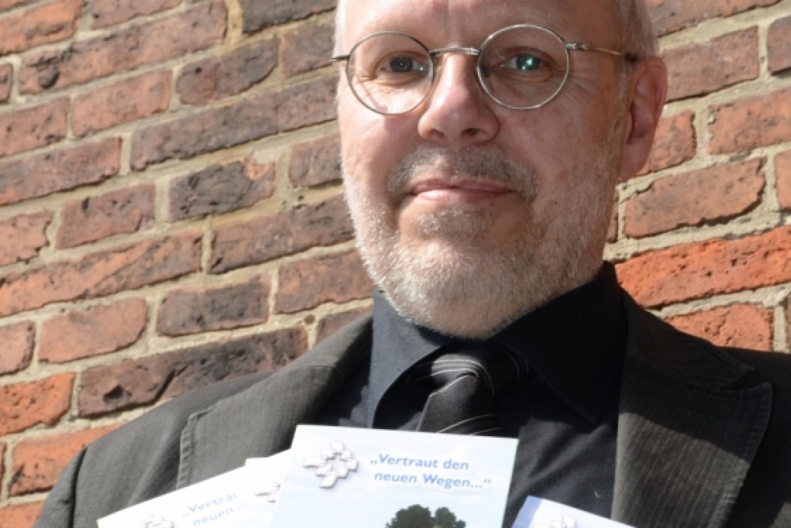 Rüstzeug für Pilger: Bernhard Memenga präsentiert Pilgerpass und Flyer für den neuen?Weg. Der Pastor gehört auch einer zehnköpfigen?Pilgergruppe aus Bunde an, die gemeinsam Wege in?Ostfriesland um in der Nachbarschaft erkundet. © Hanken