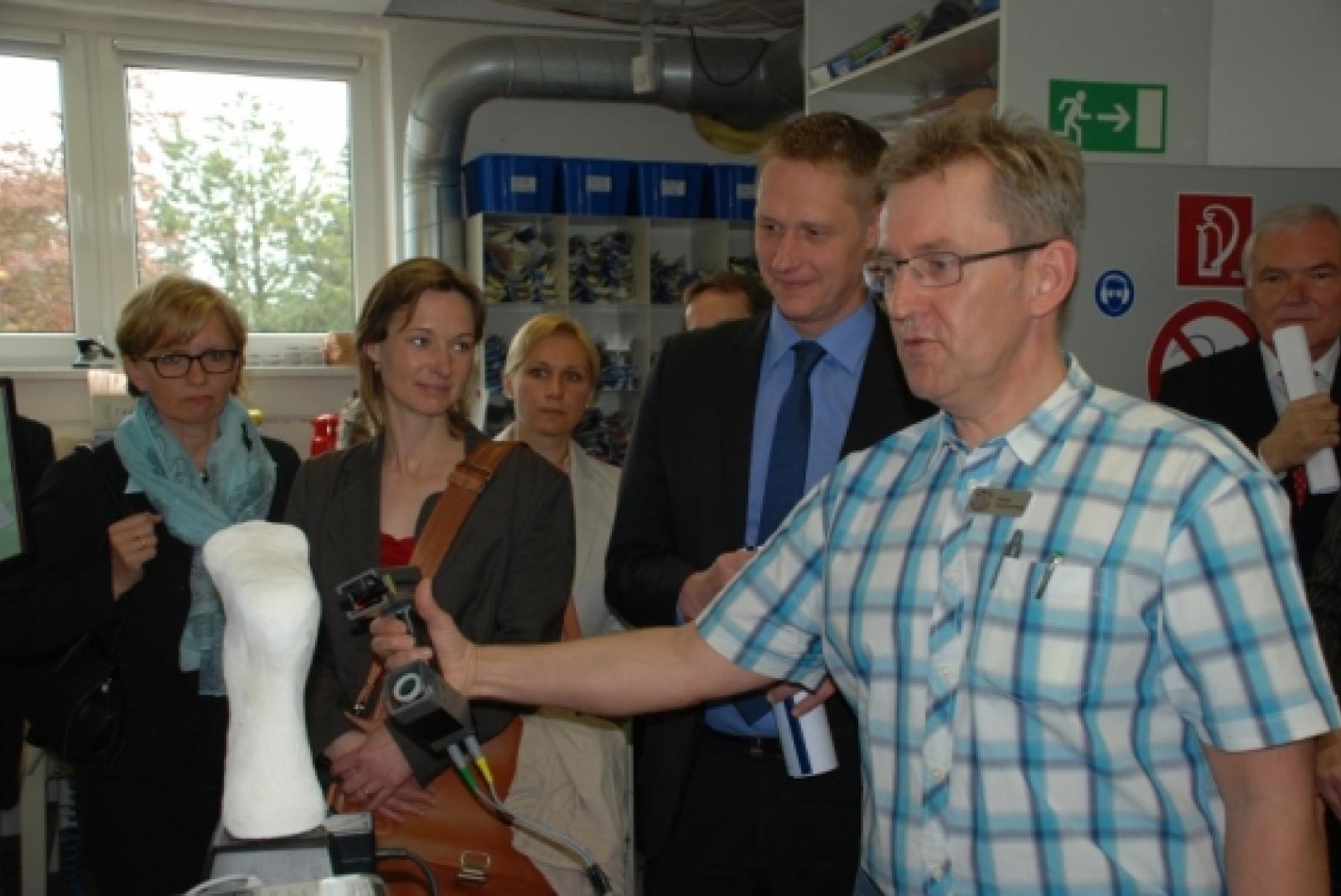 Das berührungslose Erfassen von »Fuß-Daten« für Einlagen oder Maßschuhe ermöglicht dieser Spezialscanner, den Horst Sonnenberg bei der Betriebsbesichtigung vorführte.?»Wir können auch Brandwunden-Patienten so versorgen«.  © Hoegen