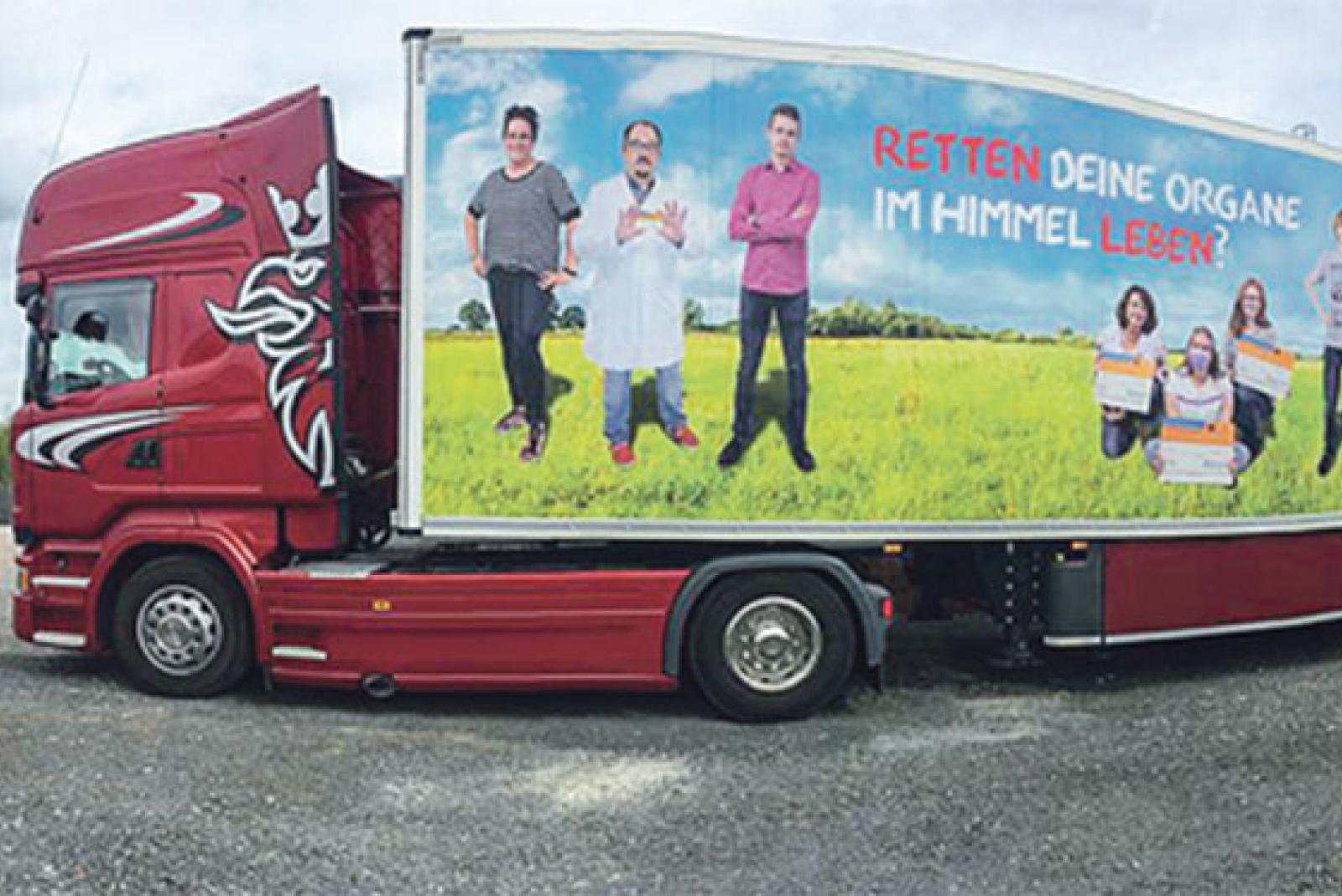 Beklebte Lastwagen machen europaweit auf das Thema »Organspende« aufmerksam