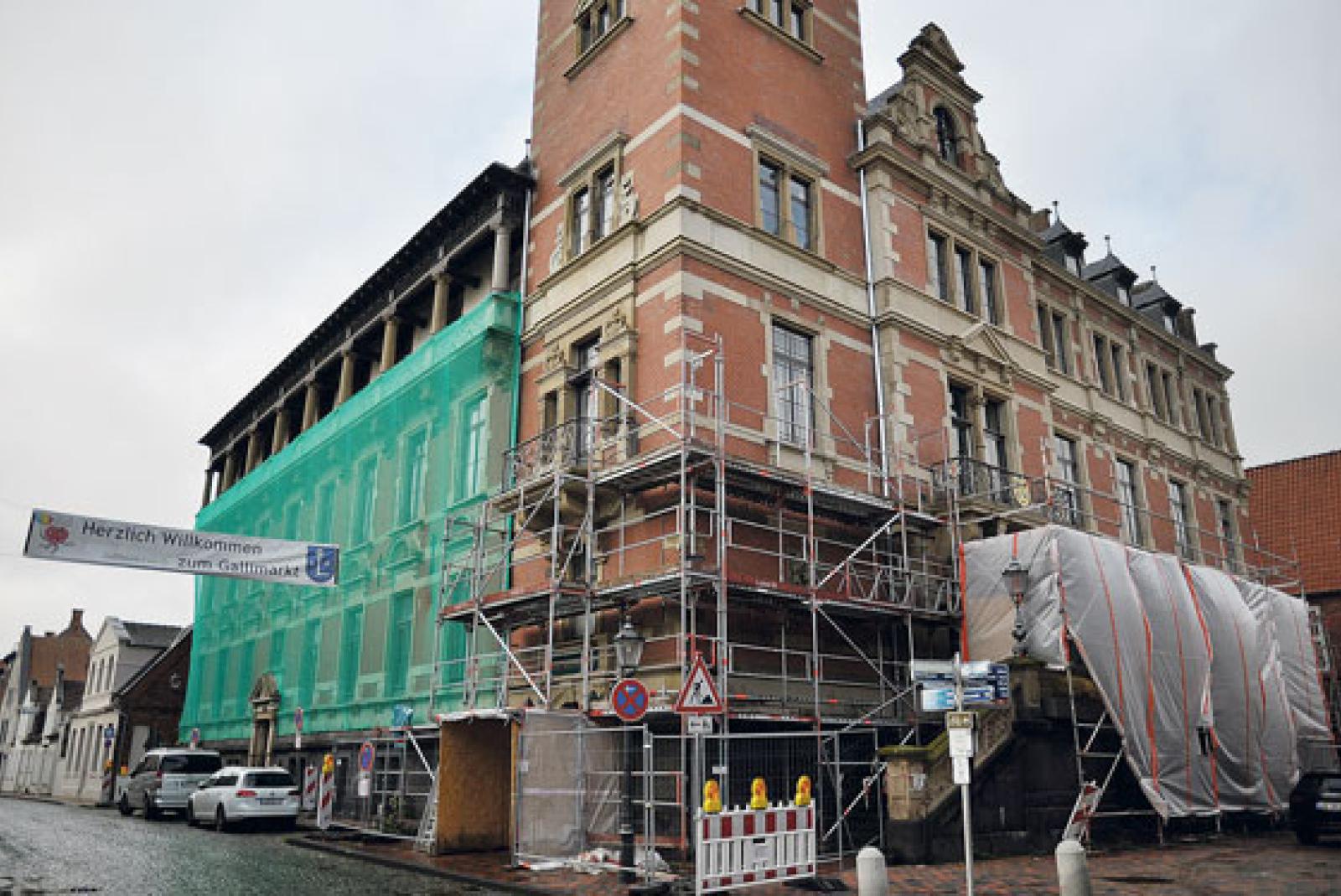 Mit einem grünen Netz am historischen Rathaus in Leer ahmt die Stadtverwaltung nicht die Verhüllung des Reichstags von 1995 nach. Vielmehr dient es dem Schutz der Gallimarkt-Besucher. »Das Netz zur Seite der Königsstraße wird zur Sicherheit weiterhin ...