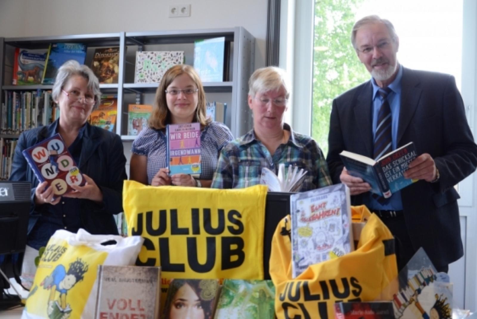 Hoffen auf viele Anmeldungen für den Julius-Club: Regina van Lengen (Gemeindebücherei Hesel), Vera Jauken (Mediothek Bunde, Susanne Fockens (Stadtbücherei Weener) und Eckhardt Schulte (VGH-Vertriebsleiter der Direktion Oldenburg). Es fehlt Sabine Laudin-Fokken von der Stadtbibliothek Leer. © Wübbena