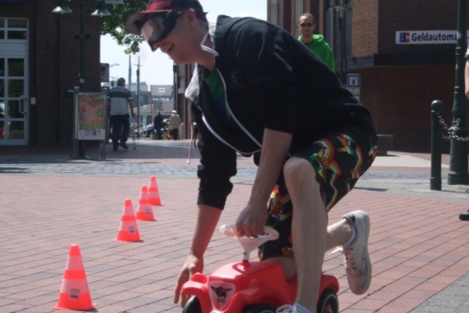 Im Rausch der Geschwindigkeit? Mit Bobbycar-Flitzer und Rauschbrille wurden auf launige Weise die Effekte einer »benebelten?Fahrt« vermittelt. © Landkreis Leer