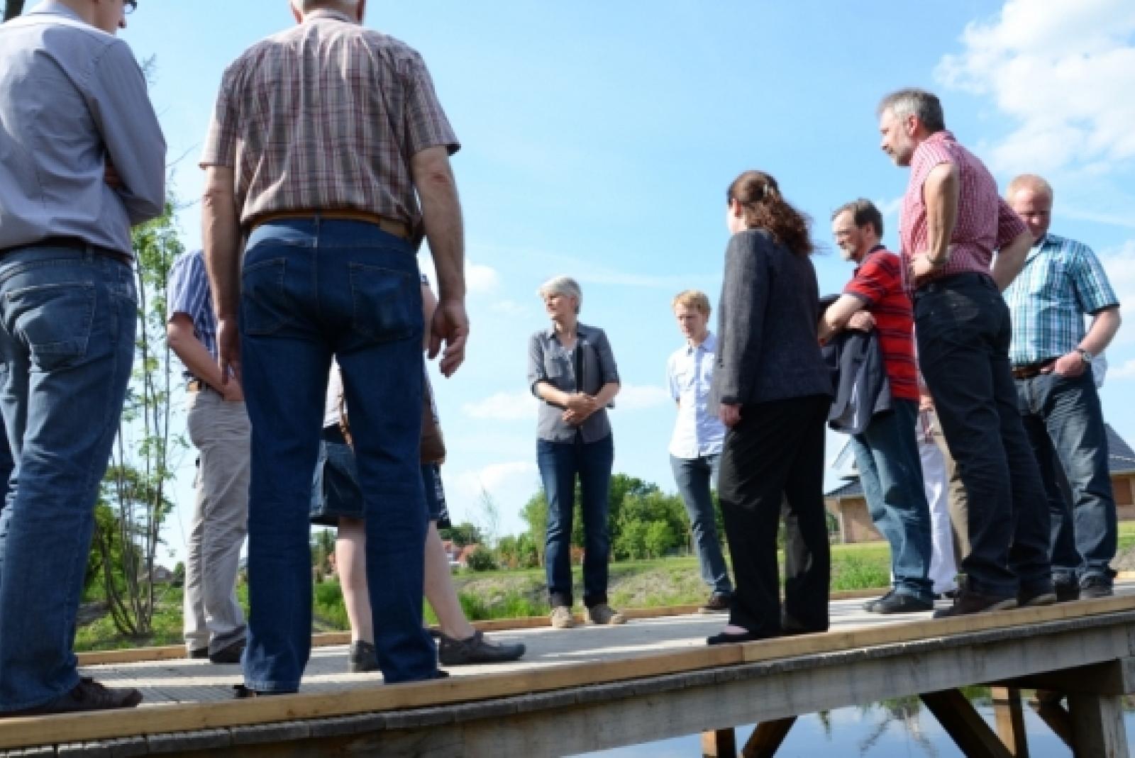 Kein Geländer am Steg, doch zur Sicherheit der Rollstuhlfahrer ein erhöhter Holzrahmen als Umrandung: Dafür hat sich Christine von Cölln (links), Gestalterin des Erholungsgebietes, ausgesprochen. © wübbena