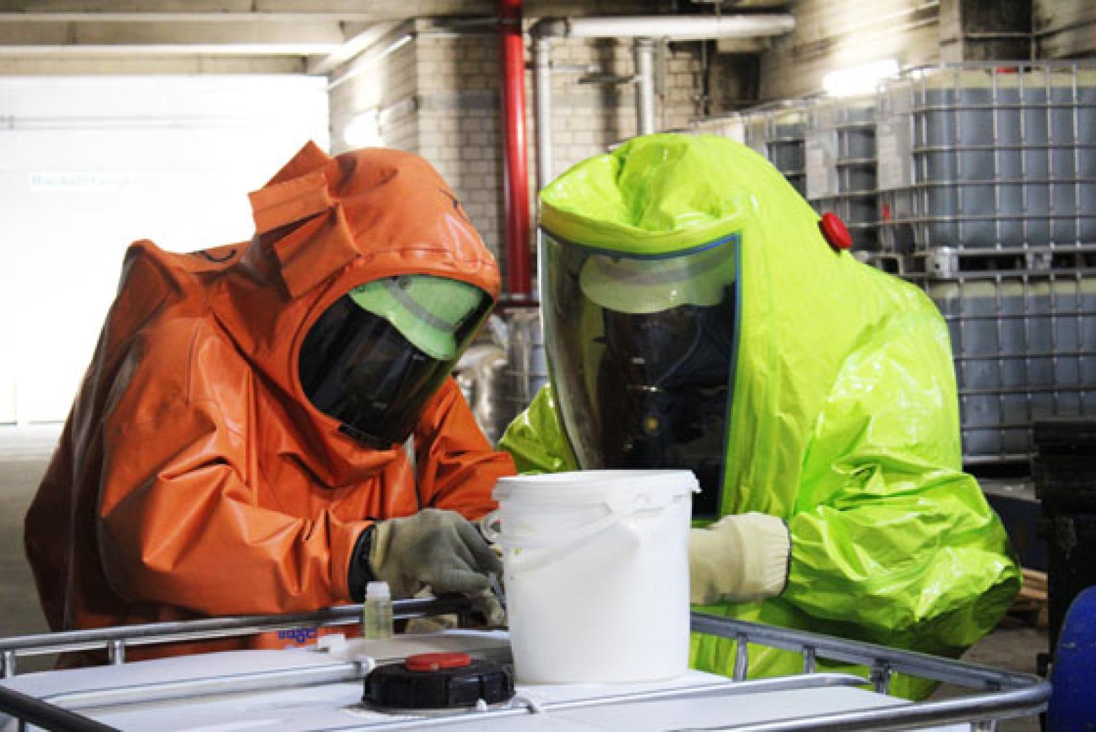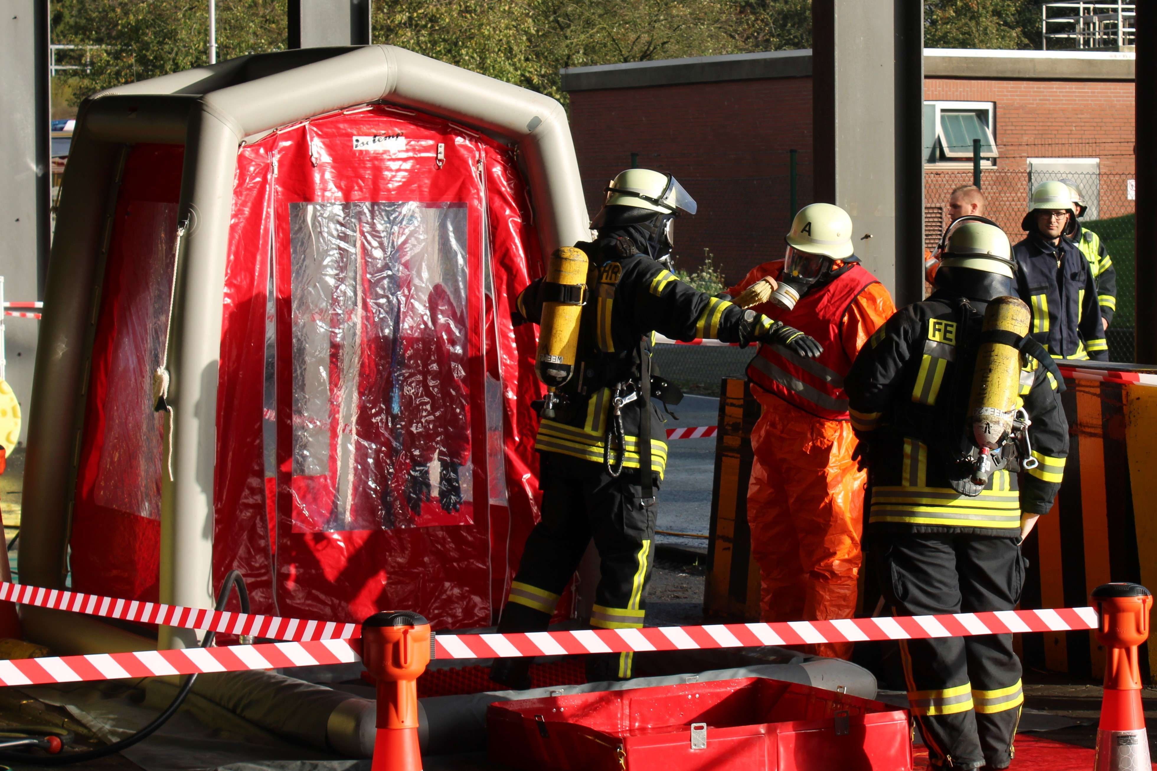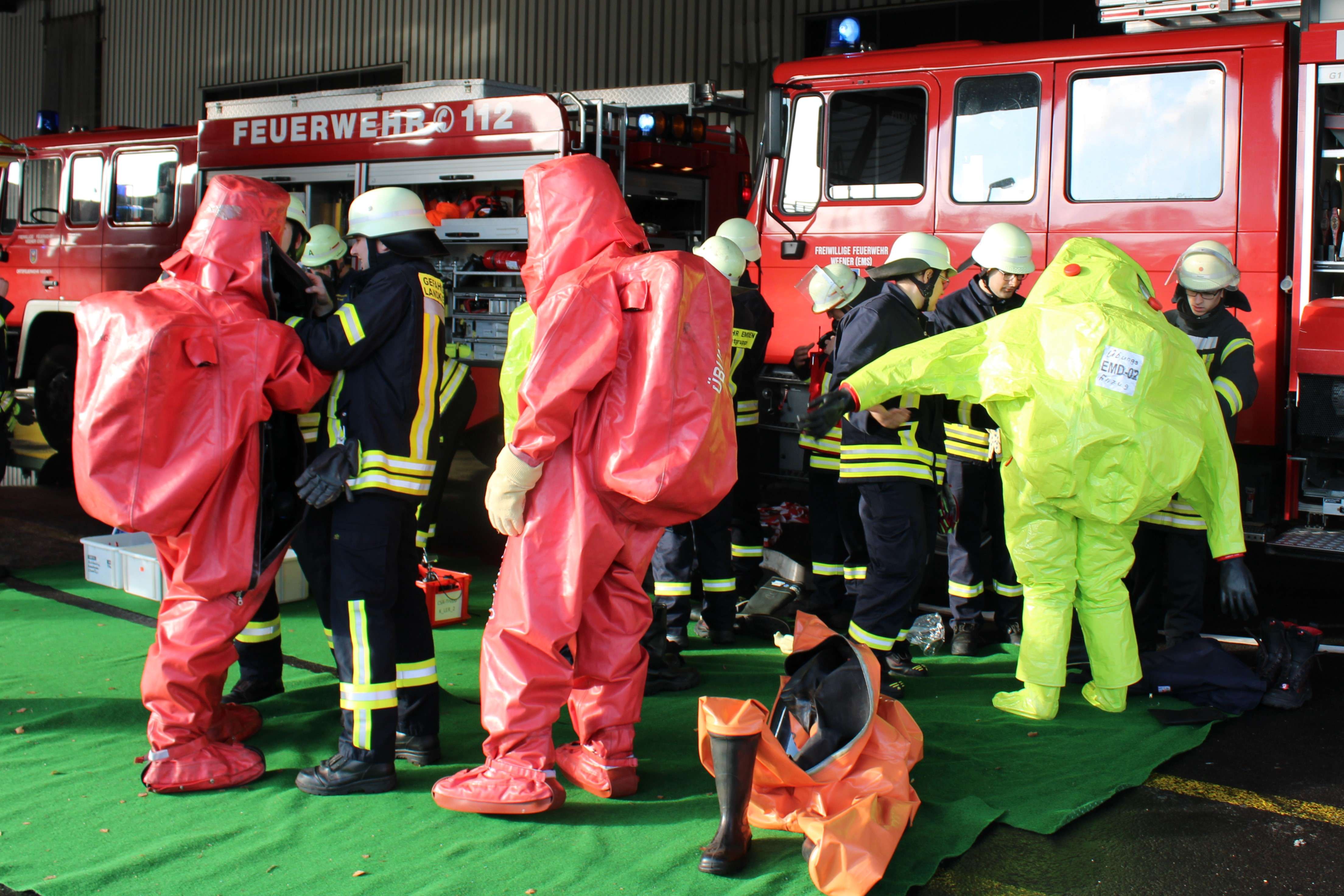 Gespenstische Szenen auf dem Gelände der Firma Klingele in Weener: In Schutzanzügen verhüllte Feuerwehrkräfte proben den Ernstfall. Am Samstag fand eine gemeinsame Übung des ABC-Gefahrgutzuges der Kreisfeuerwehr Leer, der ABC–Gefahrgutgruppe der Stadt Emden sowie der Schwerpunkfeuerwehr Weener und der Malteser Hilfsdienst Ortsgliederung Bockhorst–Rhauderfehn statt.