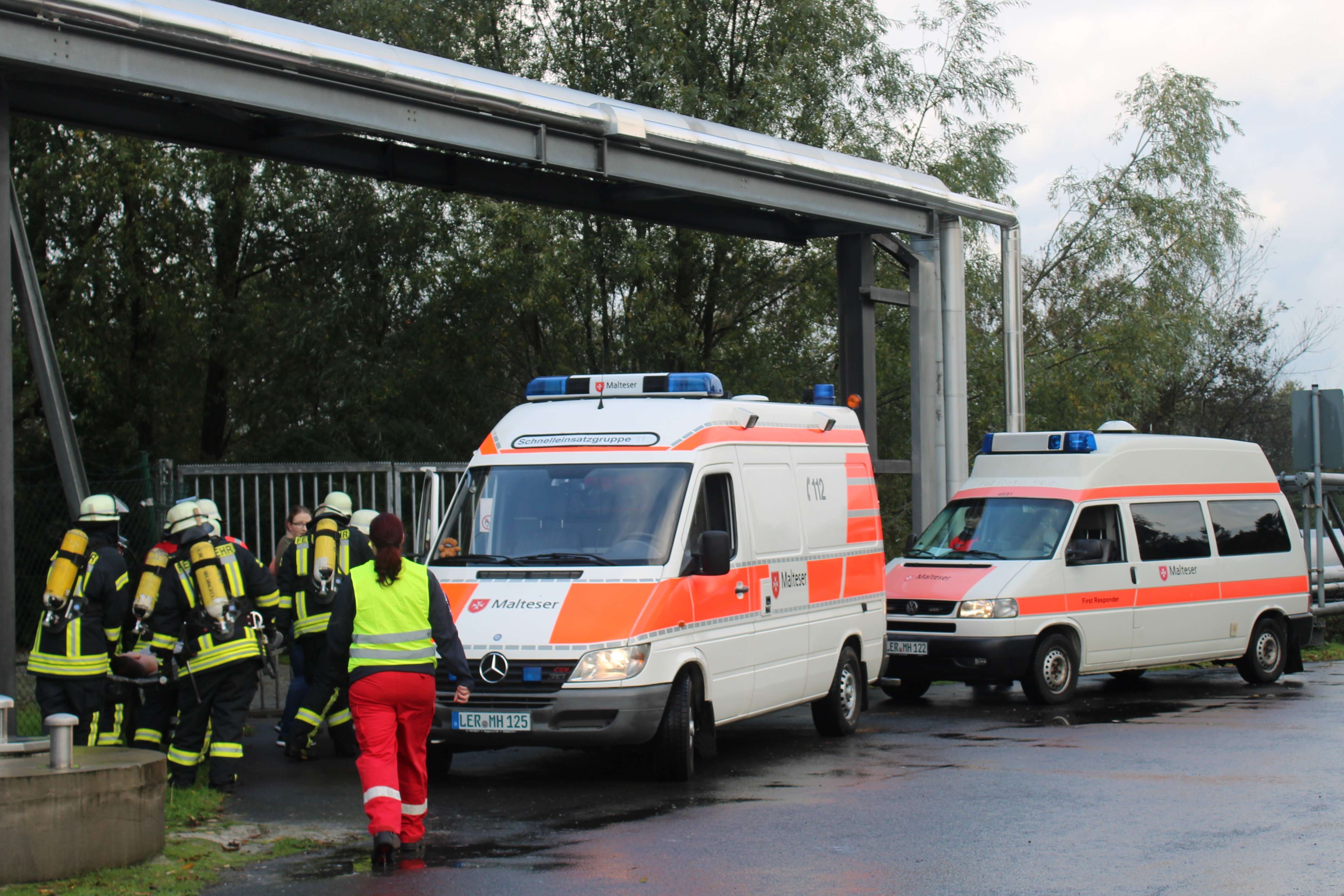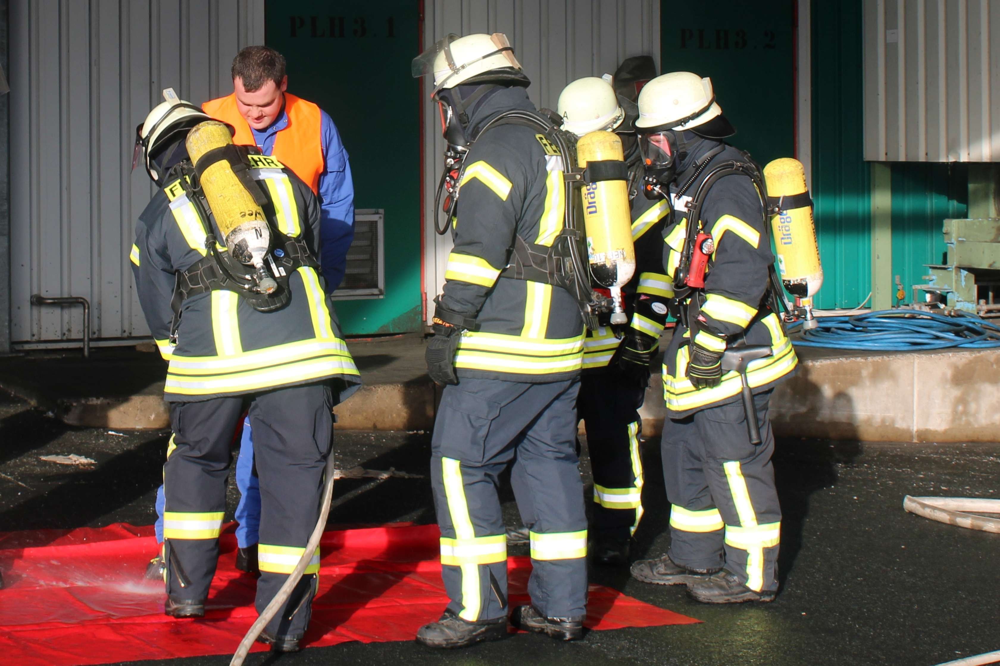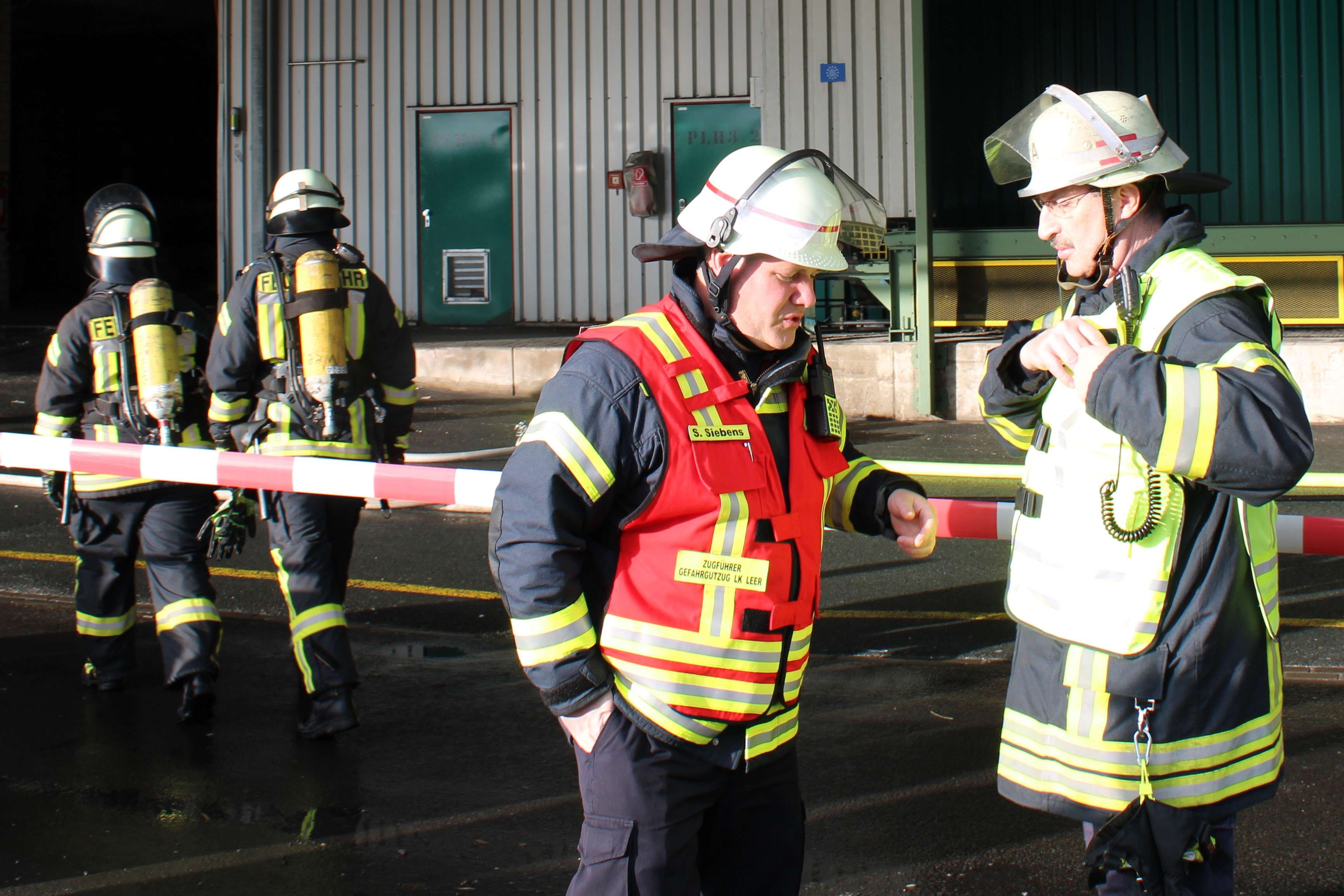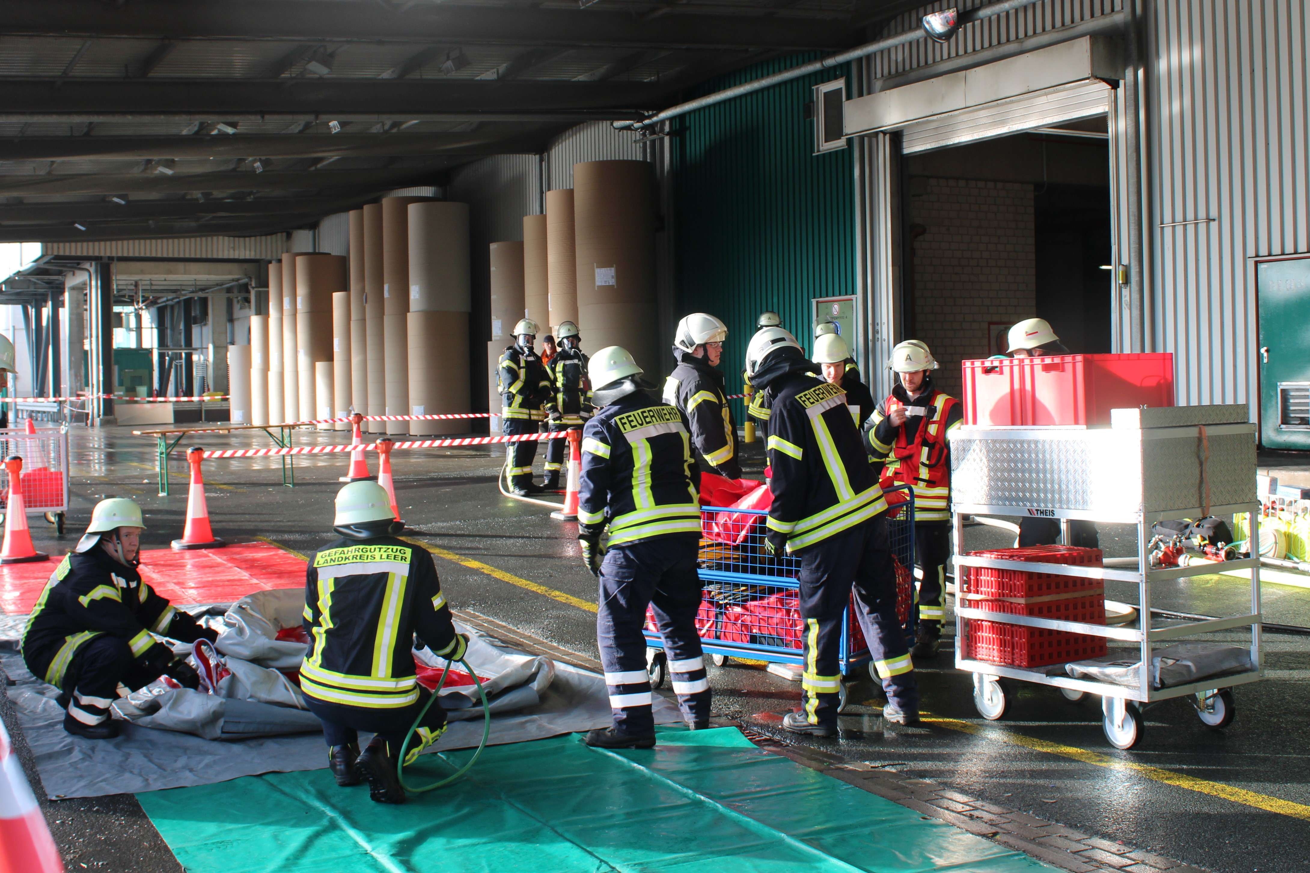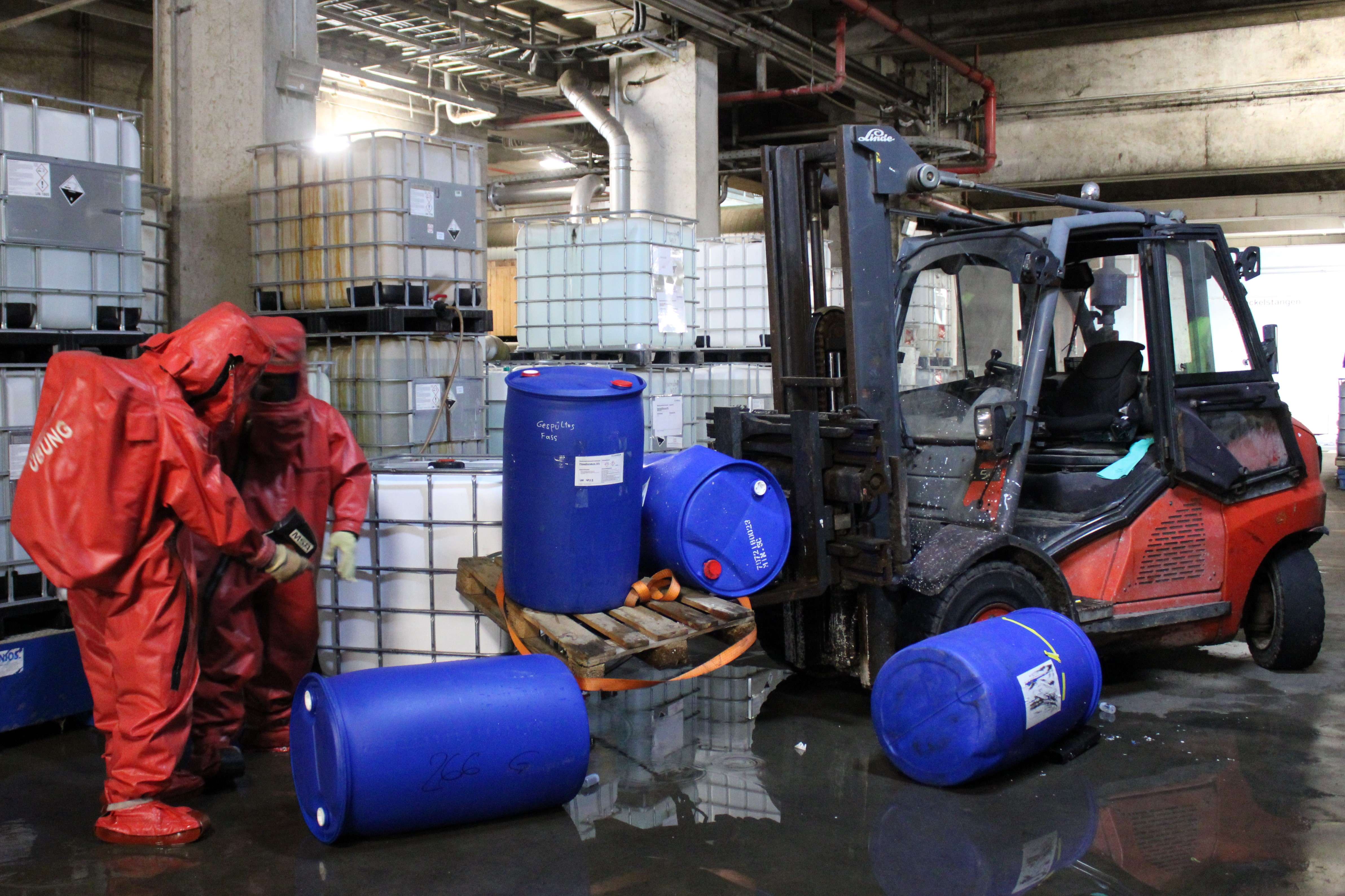 Das Übungsszenario: Angenommen wurde ein Gefahrgutunfall auf dem Werksgelände der Papierfabrik Klingele in Weener mit mehreren Verletzten. Für die Durchführung des Produktionsprozesses von Wellpappe werden in einem gekennzeichneten Bereich in der Produktionshalle unterschiedliche Chemikalien in Behältnissen gelagert. Am frühen Samstagmorgen ist es, so die Übung, bei einer Anlieferung neuer Behälter zu einem Zwischenfall gekommen. Mit einem Gabelstapler wurden mehrere Behältnisse beschädigt. Mäßige Mengen mehrerer Gefahrstoffe sind ausgetreten. Außerdem kam es zu Personenschäden.