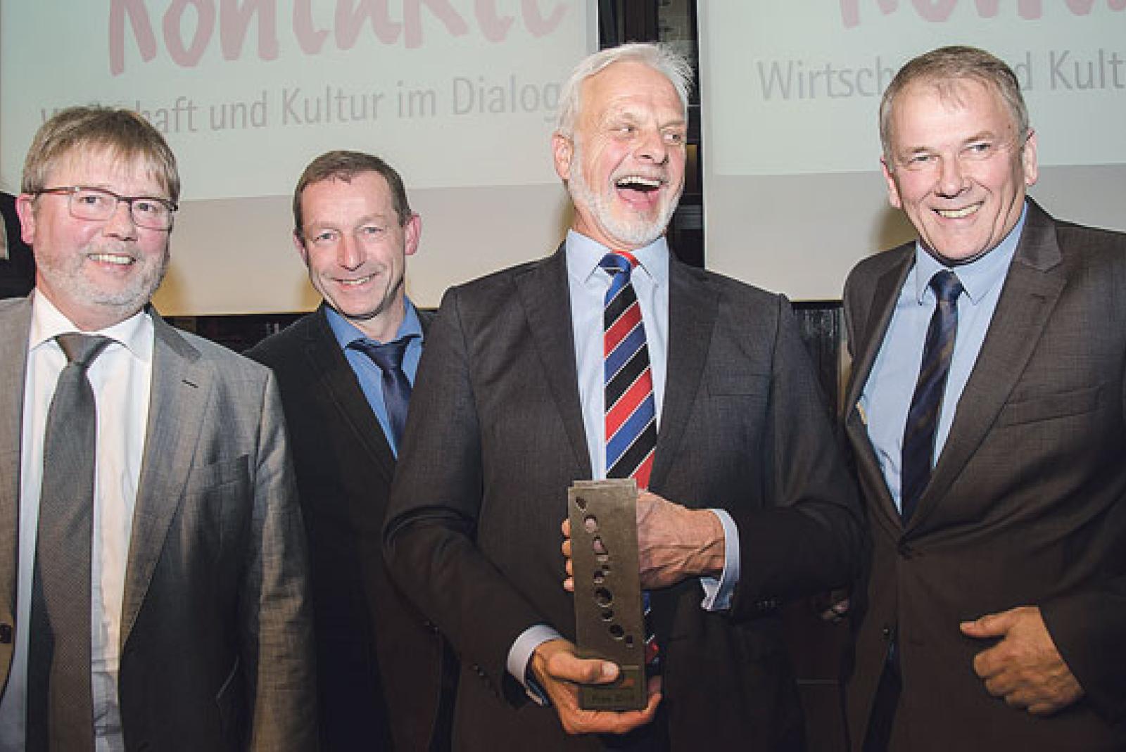 Besondere Ehre für den Unternehmer Helmuth A. Brümmer aus Bunderhee (2. von rechts): Der Enova-Chef wurde am Donnerstag im Landschaftsforum in Aurich mit dem prestigeträchtigten KulturKontakte-Preis geehrt. Mit dieser Auszeichnung, die niedersachsenweit vergeben wird, werden Unternehmen hervorgehoben, die ...