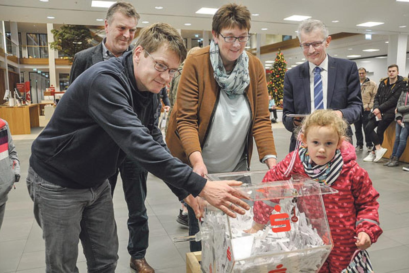Bei der Weihnachtsverlosung der Werbegemeinschaft Leer zugunsten der Lebenshilfe und des Kinderschutzbundes hat Sarah-Fee Wojewodtka aus Leer den Hauptpreis der Los-Serie A gewonnen - einen Seat Mii. Die vierjährige Fenja aus Emden hatte unter den Augen von Christian Hildebrandt (Kinderschutz), Carsten Mohr (Werbegemeinschaft), Jutta Blank (Lebenshilfe) und Notar Detlef Gühmann (im Bild von links) die Nummer A 13414 aus der Lostrommel gezogen. In der Serie B zog die zehnjährige Aike aus Ihrhove als Hauptgewinn die Nummer B 56350. Inzwischen werden Lose der Serie F verkauft.