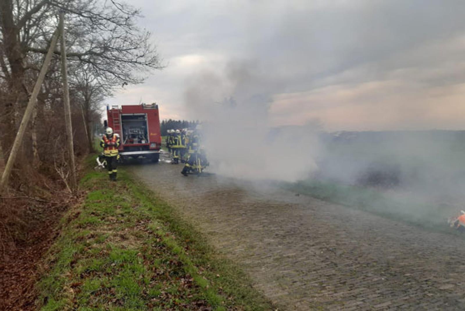 Wie die Kreisfeuerwehr mitteilte, fiel dem Fahrer um 12.36 Uhr plötzlich die Rauchentwicklung an seinem Seat auf. Er fuhr den Wagen noch einige Meter weiter, in sicherem Abstand zu Häusern und Bäumen, stoppte dann und alarmierte die Feuerwehr.
