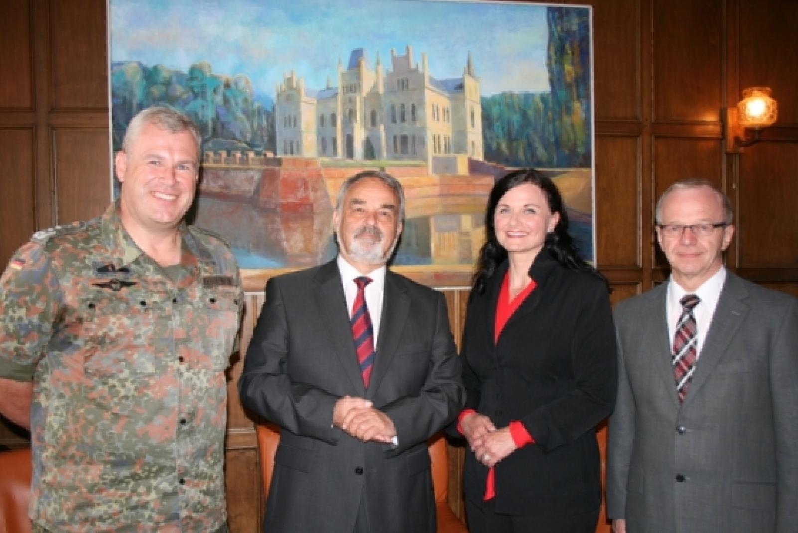 Dr. Ralf Hoffmann (von links), Thomas Kossendey, Gitta Connemann und Landrat Bernhard Bramlage im Gebäude der Offizierheimgesellschaft. Im Hintergrund ein Gemälde der Evenburg, Namensgeber der Kaserne in Leer. © Meyer