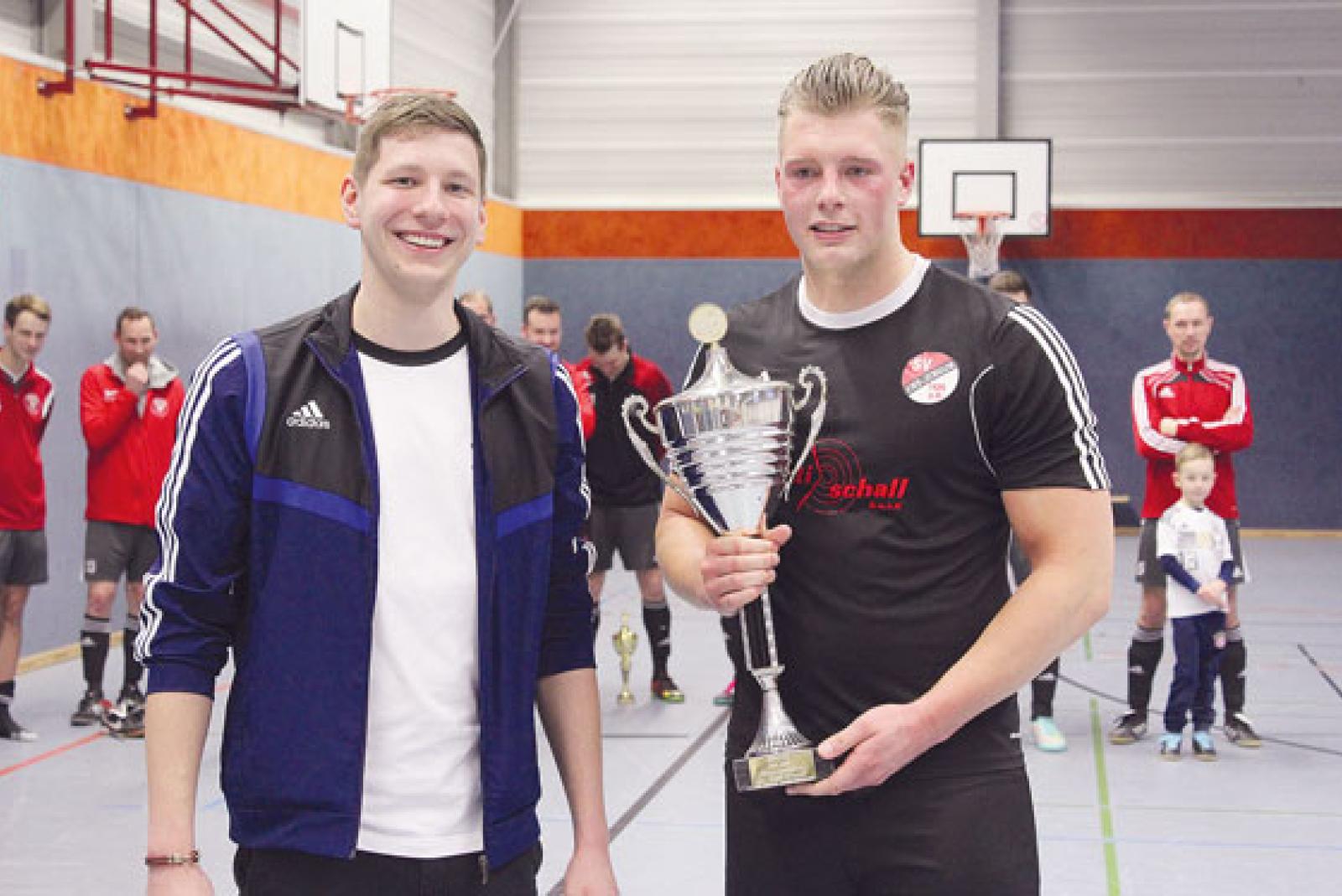 Mark Bruns vom SV Ems Jemgum (rechts) nahm den Rheiderland-Hallenpokal von Hauke Buß vom MTV Ditzum entgegen. In einem packenden Finale bezwangen die Jemgumer TV Bunde II mit 2:1. Die haushohen Favoriten von TV Bunde I kamen aufgrund einer Niederlage gegen ...
