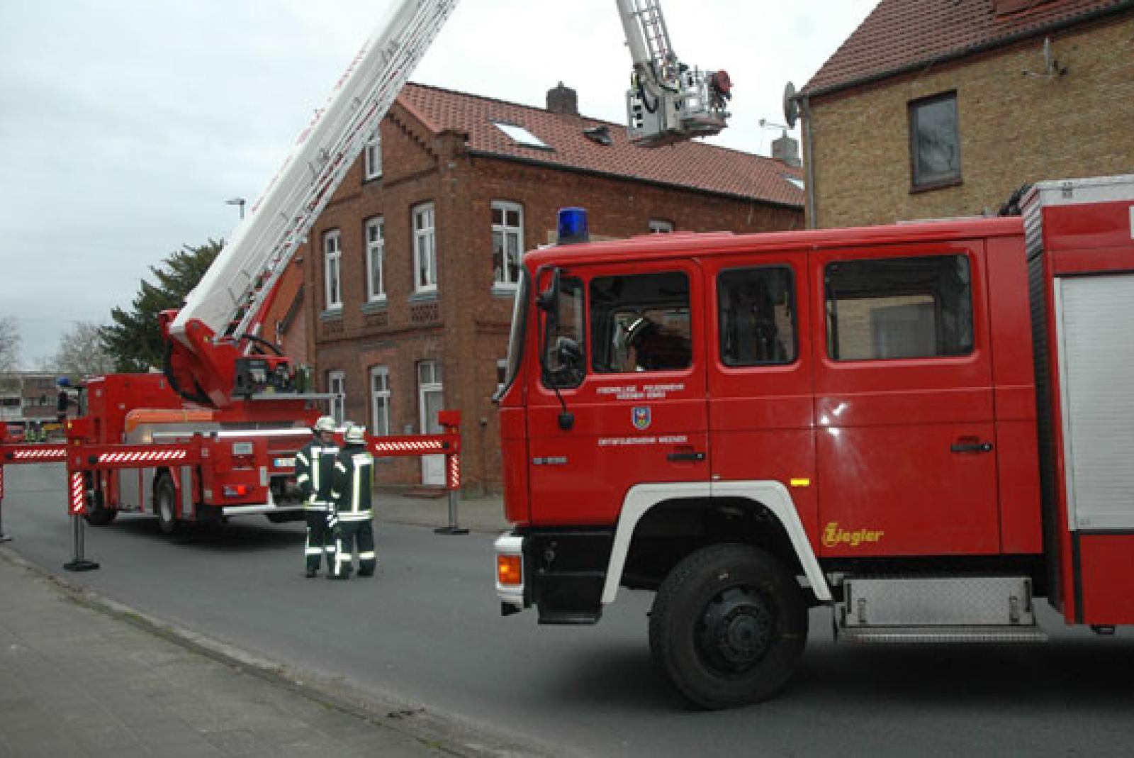 In Weener rückten die Feuerwehrleute gegen 14 Uhr mit der Hubrettungsbühne in die Risiusstraße aus, die während des Einsatzes voll gesperrt werden musste. Hier hatte sich auf einem Wohnhaus die Bleischürze eines Schornsteins gelöst, die Einsatzkräfte holten sie vom Dach.