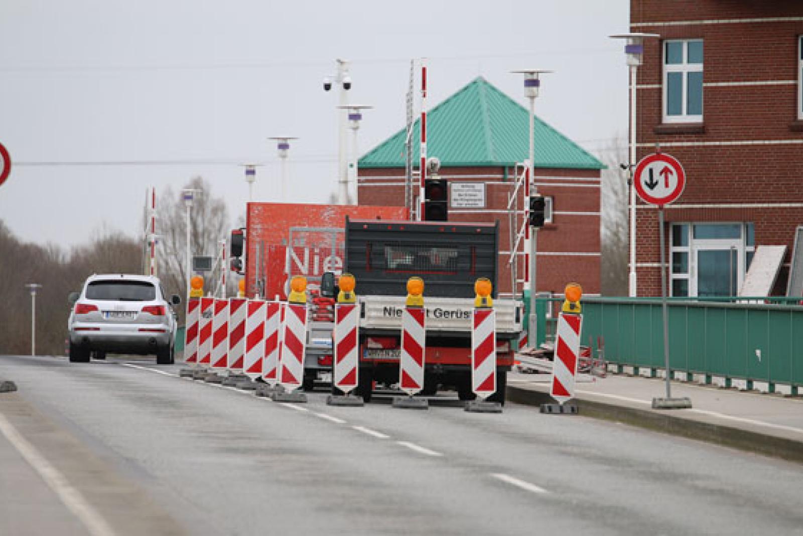 Auf der Jann Berghaus Brücke kam es heute morgen zu Verkehrsbehinderungen, verursacht durch die Arbeiten einer Spezialfirma, die einem Sturmschaden vom Wochenende am Brückenwärterhaus reparierte. In Fahrtrichtung Leer aus dem Rheiderland kommend war die Fahrbahn durch ein Firmenfahrzeug gesperrt, auch standen Signalbaken auf der Fahrbahn. Es galt Tempo 30 und ein Überholverbot. Mittlerweile sind die Arbeiten beendet, der Verkehr fließt wieder ungehindert über die Brücke.
