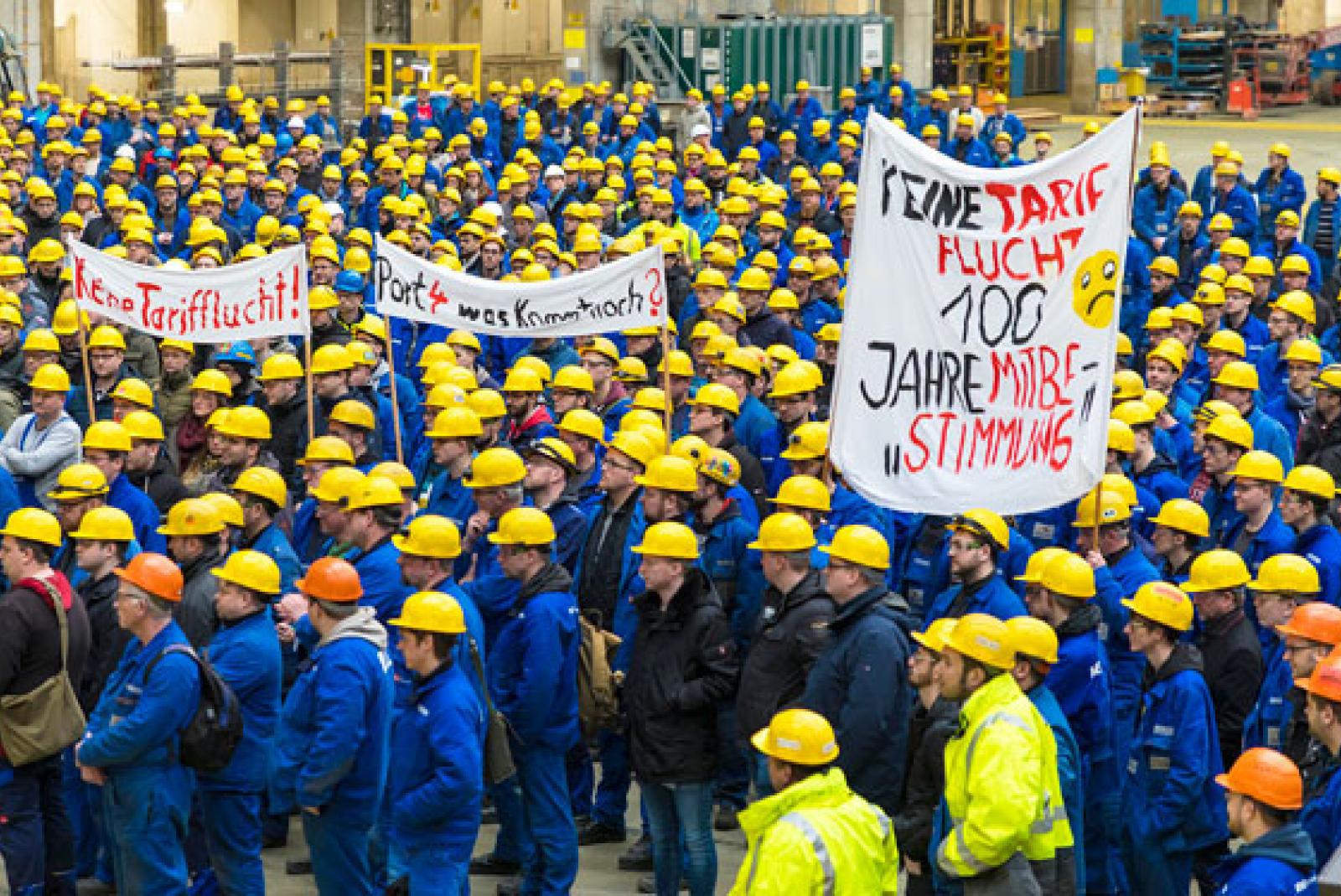 Gegen eine weitere Auslagerung von Arbeitsplätzen haben am Montage Beschäftigte der Meyer Werft Papenburg Front gemacht.