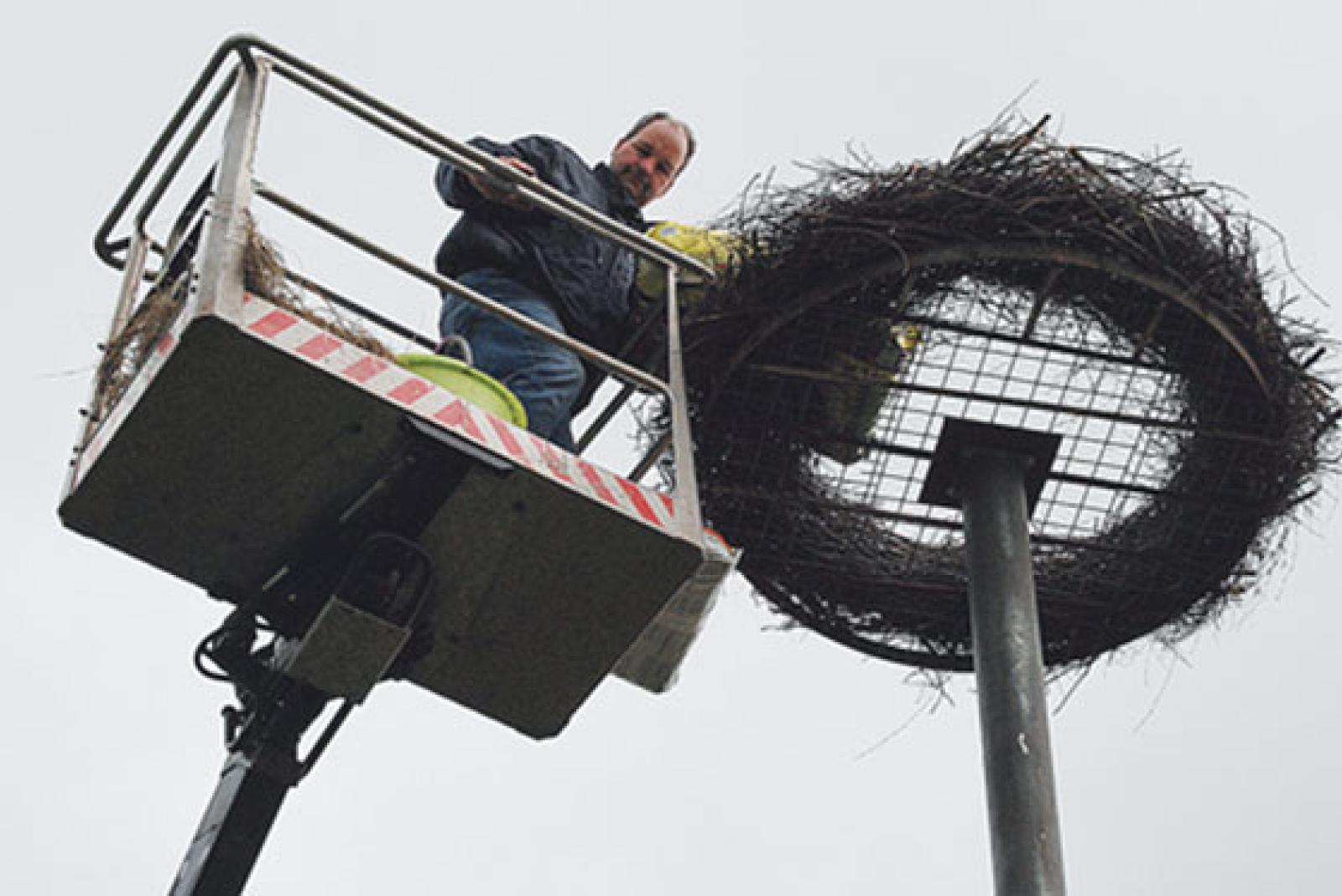 Auf einer Weide hinter der Wohnbebauung an der Kirchstraße in Holthusen haben Mitglieder des Vogelzucht- und Naturschutzvereins Weener jetzt dem Storch ein Nest »bereitet«.