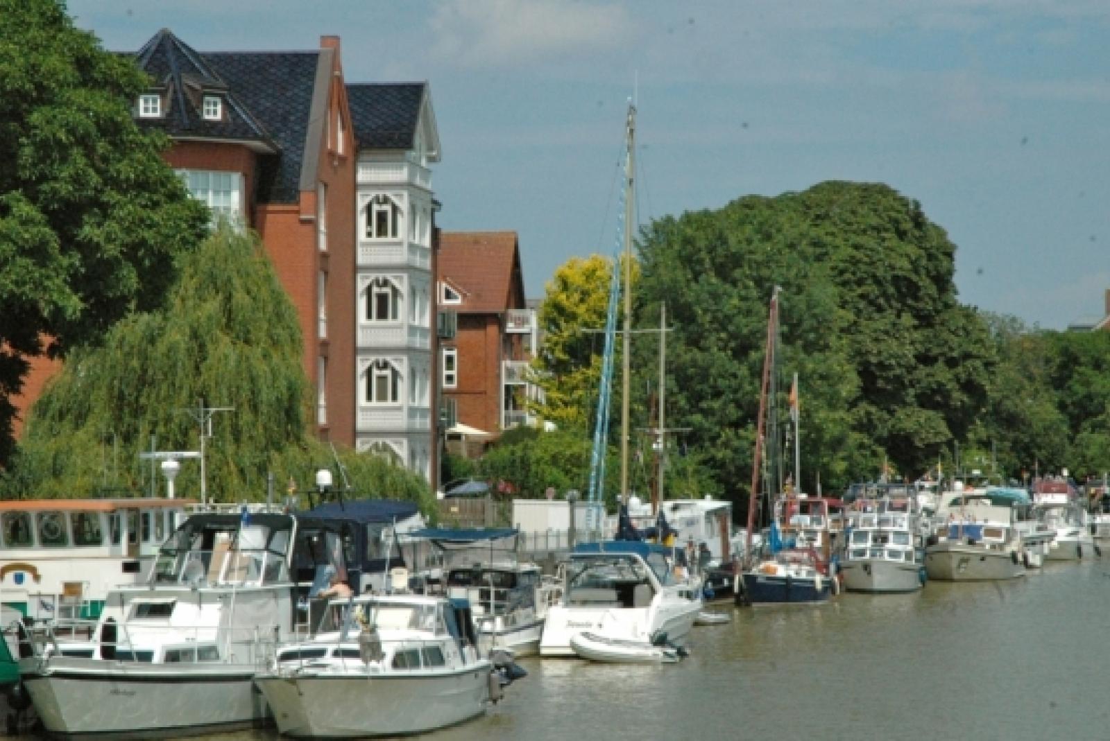 Teilweise in dritter Reihe haben die Motoryachten und -boote an der Uferpromenade in Leer festgemacht. Unser Bild zeigt den Blick von der Rathausbrücke auf die Altstadt-Seite des Freizeithafens. © Szyska