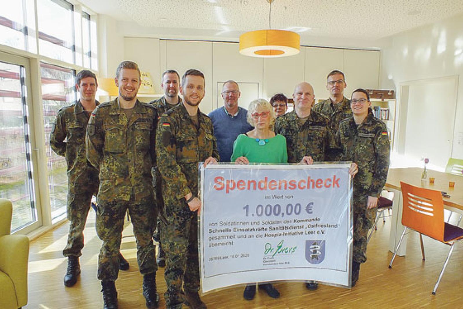 Die Hospiz Initiative in Leer kann sich über eine Spende in Höhe von 1000 Euro von den Soldaten des Kommandos schnelle Einsatzkräfte Sanitätsdienst (Kdo. SES) freuen. Das Geld stammt aus dem Überschuss der Jahresabschlussfeier des Kdo. SES. Das ...