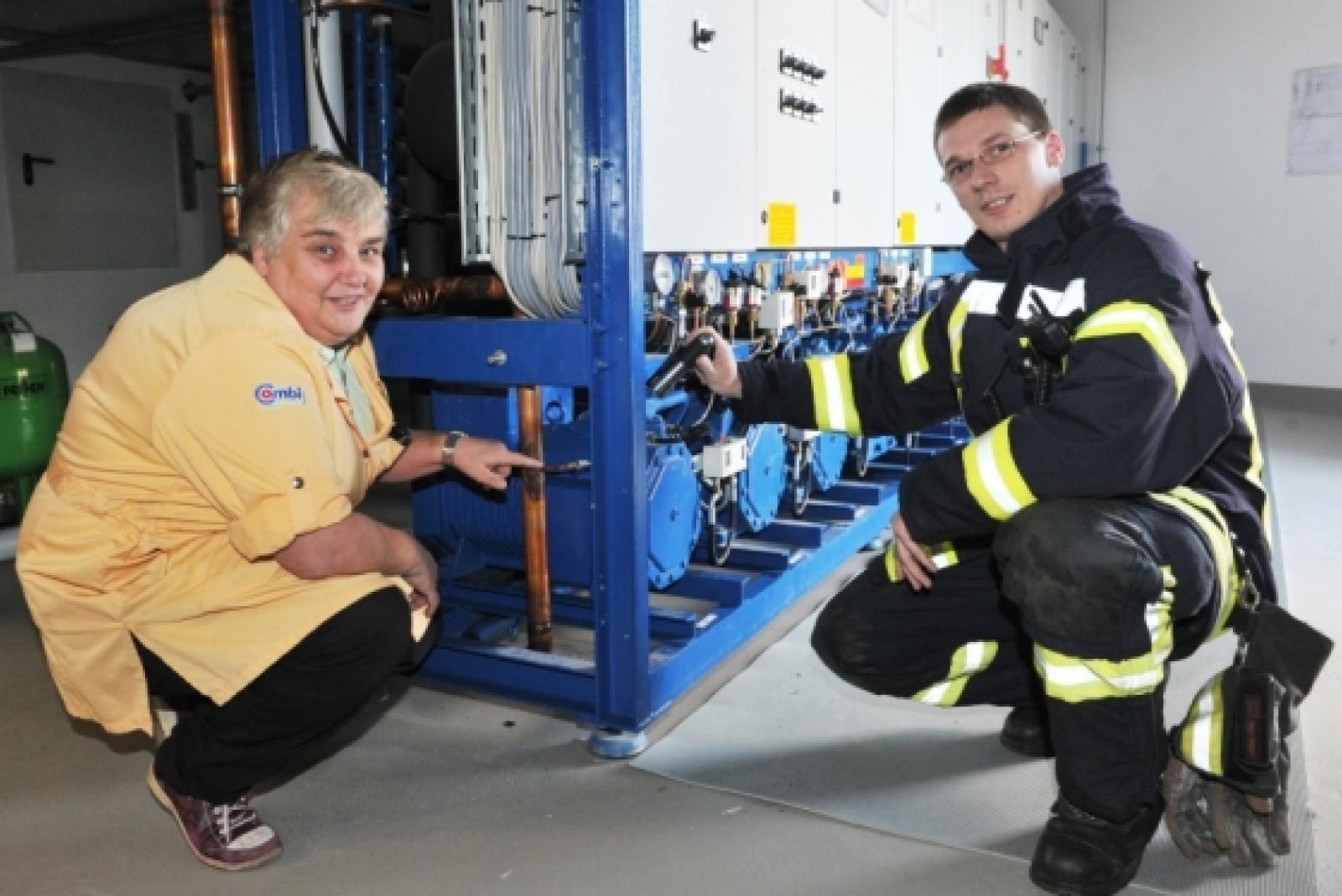 Kleines Loch - große Wirkung: Ingrid Jans (stellvertretende Marktleiterin) und Dennis Iwanoff (Einsatzleiter der Bunder Feuerwehr) begutachten das Leck der Druckleitung, das gestern zur Evakuierung des Combi-Marktes in Bunde führte. © Foto: Bruins