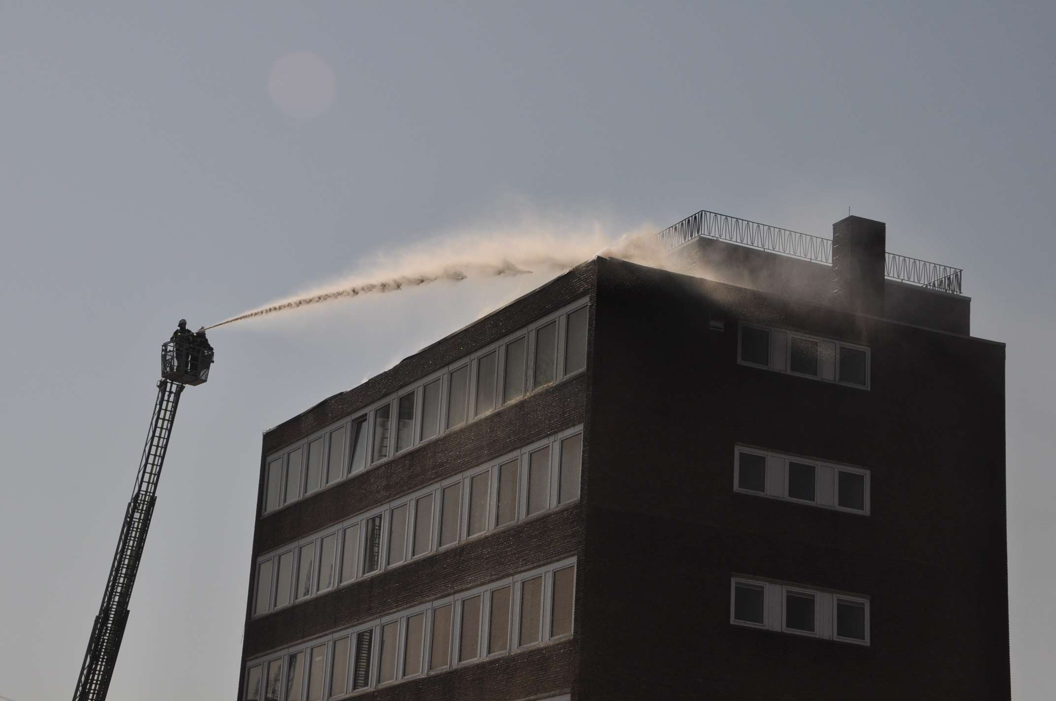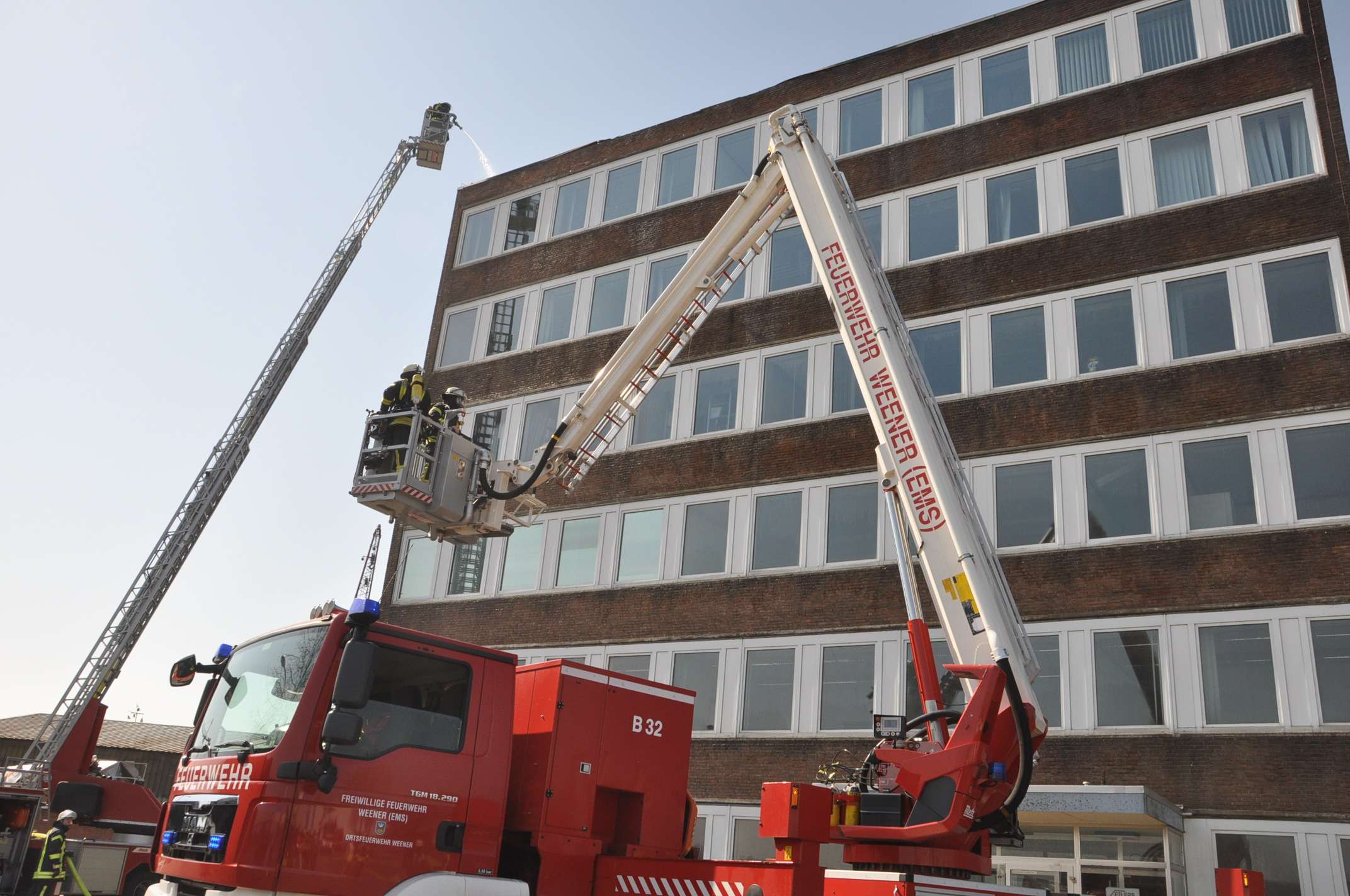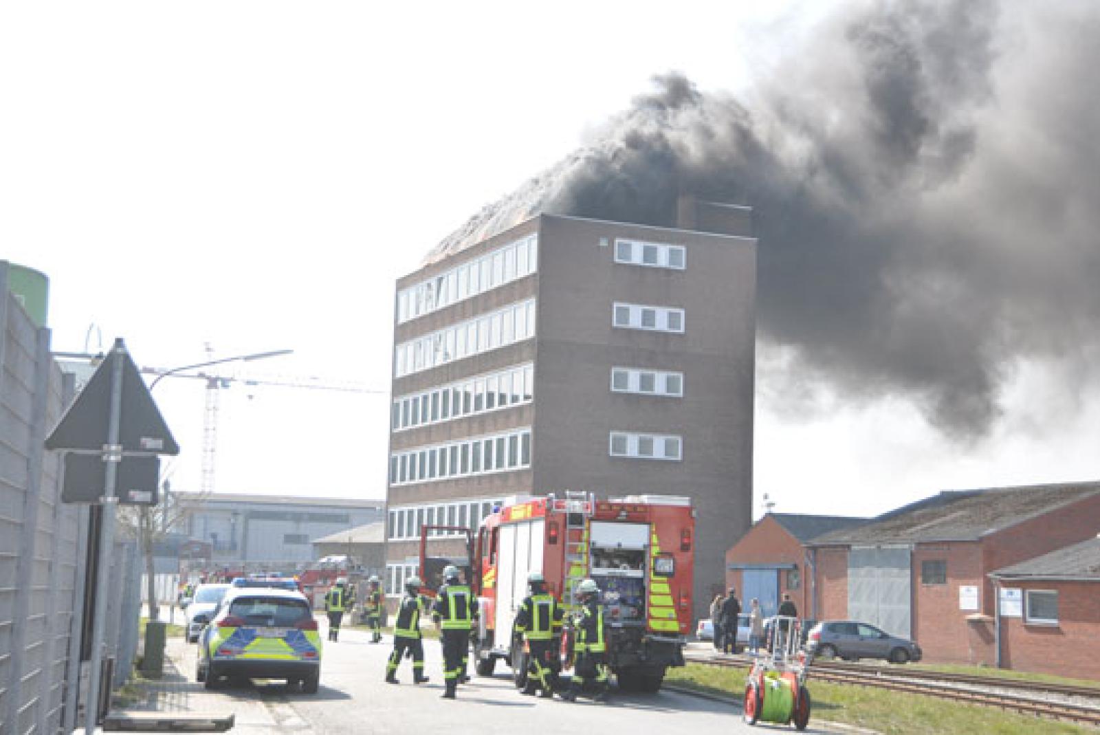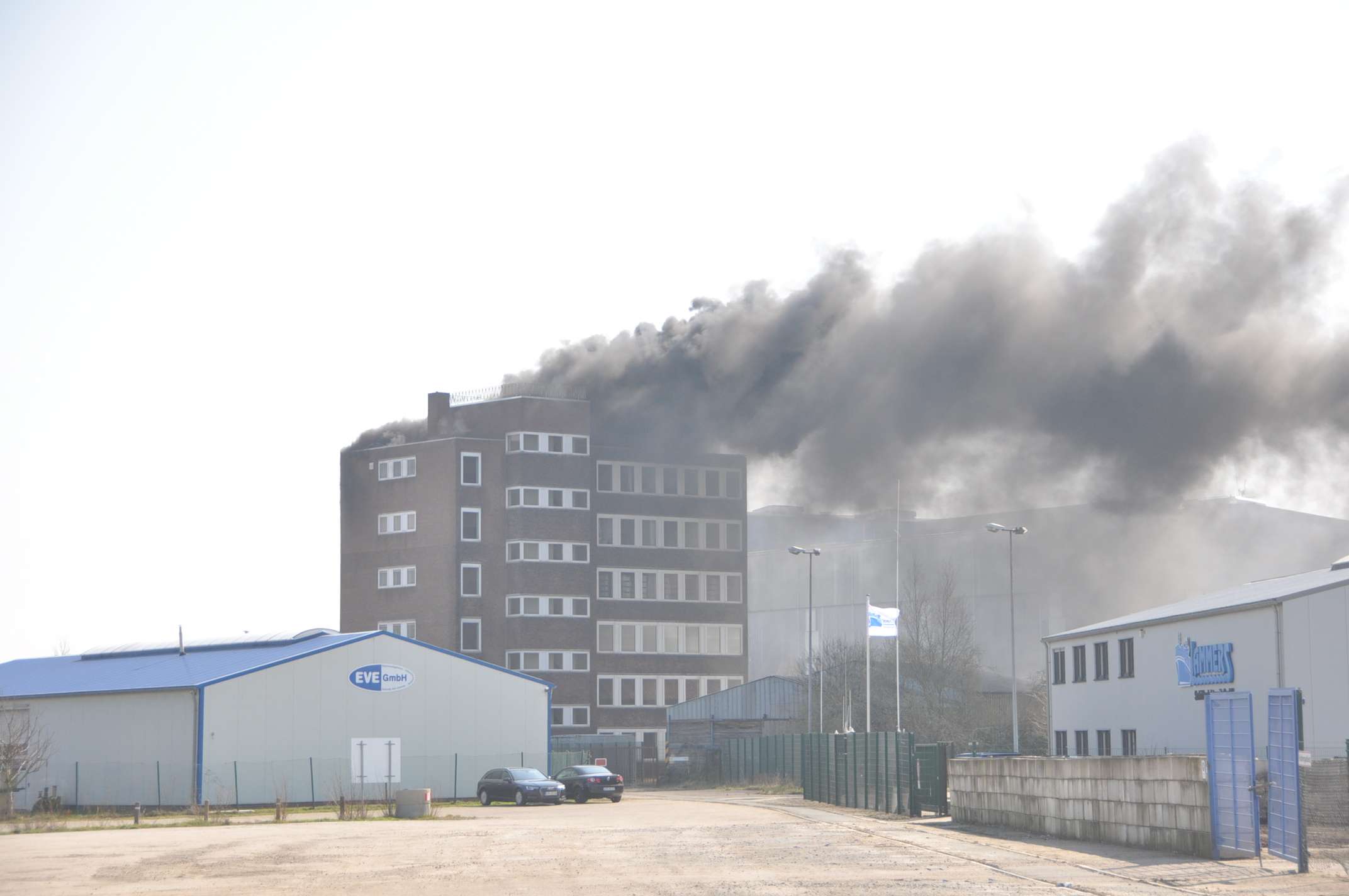 Um 11.51 Uhr wurde die Leeraner Feuerwehr heute zu einem Einsatz in die Industriestraße gerufen. Das Dach des sechsstöckigen ehemaligen Verwaltungsgebäudes der Jansen Werft stand in Flammen. Wenige Minuten nach der ersten Meldung war die Feuerwehr mit einem Großaufgebot vor Ort.