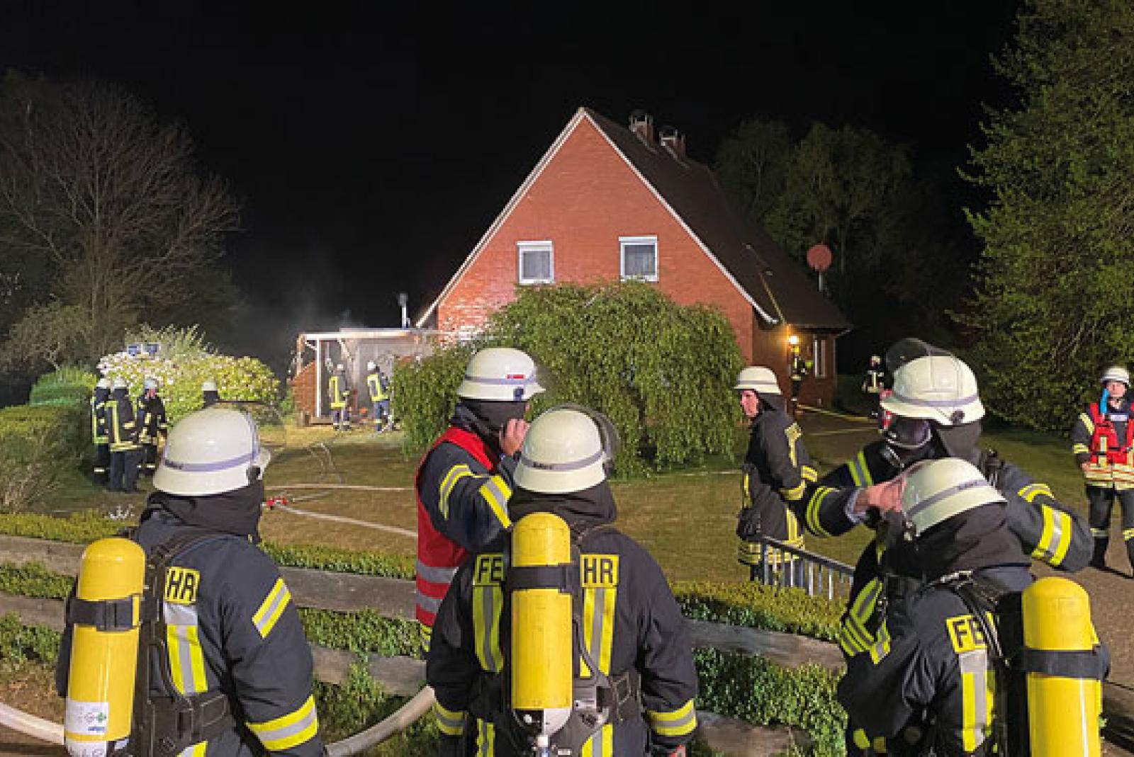 Die Freiwillige Feuerwehr Südbrookmerland wurde mit vier von fünf Ortsfeuerwehren um 21.43 Uhr alarmiert. Nur wenige Minuten nach der Alarmierung trafen die ersten Löschfahrzeuge an der Einsatzstelle ein. Es schlugen bereits hohe Flammen aus dem Wintergarten, die drohten, auf das Einfamilienhaus überzugehen. Durch den sofortigen Einsatz eines Rohres zur Brandbekämpfung und eines Rohres zur Abriegelung der Flammen zum Wohnhaus, konnte eine Brandausbreitung verhindert werden. Weiterhin wurde vorsorglich ein Rohr vor dem Haus in Stellung gebracht, um bei Bedarf einen sofortigen Innenangriff vorzunehmen. Der Brandrauch zog in das Innere des Hauses, sodass man mit einem Hochleistungslüfter die Räumlichkeiten wieder vom Rauch befreite.
