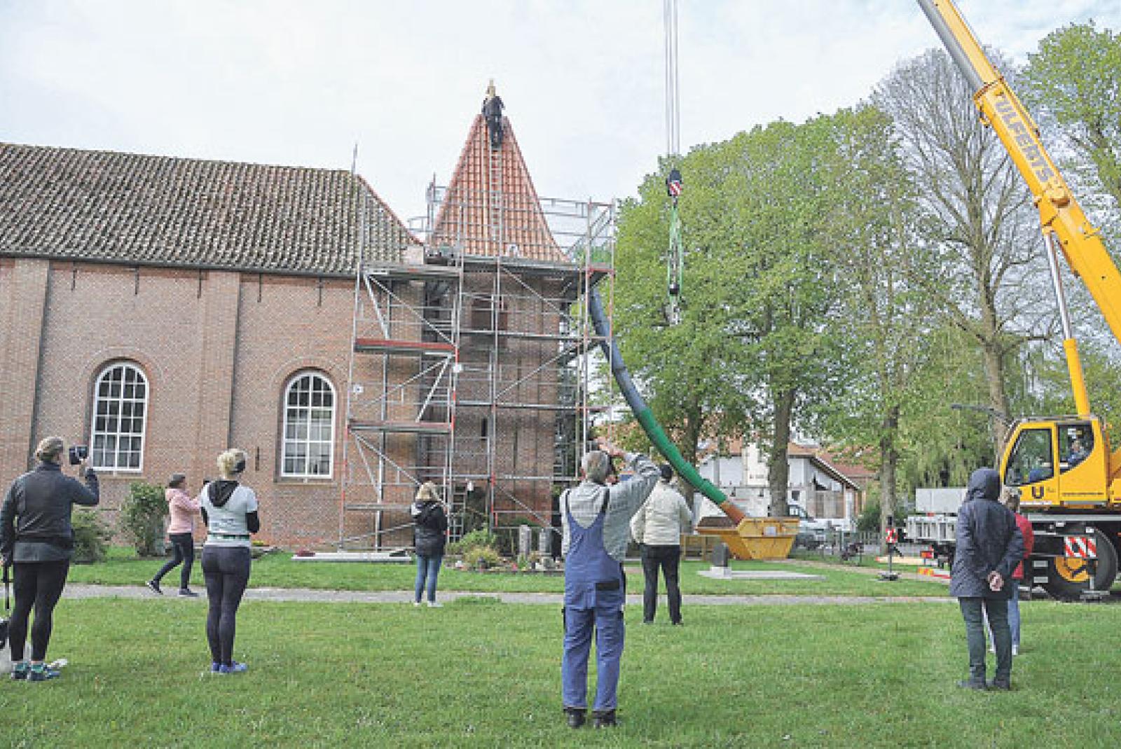 Mit einem Kran wurde »Dachzierde« auf Kirchturm in Kirchborgum montiert