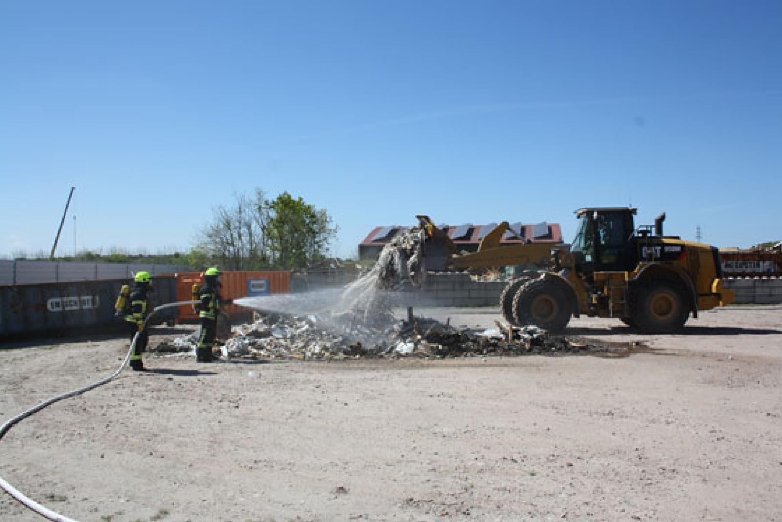 Nach rund eineinhalb Stunden war ein Großteil des Feuers gelöscht, die eingesetzten Kräfte konnten nun mit einem Radlader das Brandgut aus der Halle entfernen und unter freiem Himmel ablöschen.