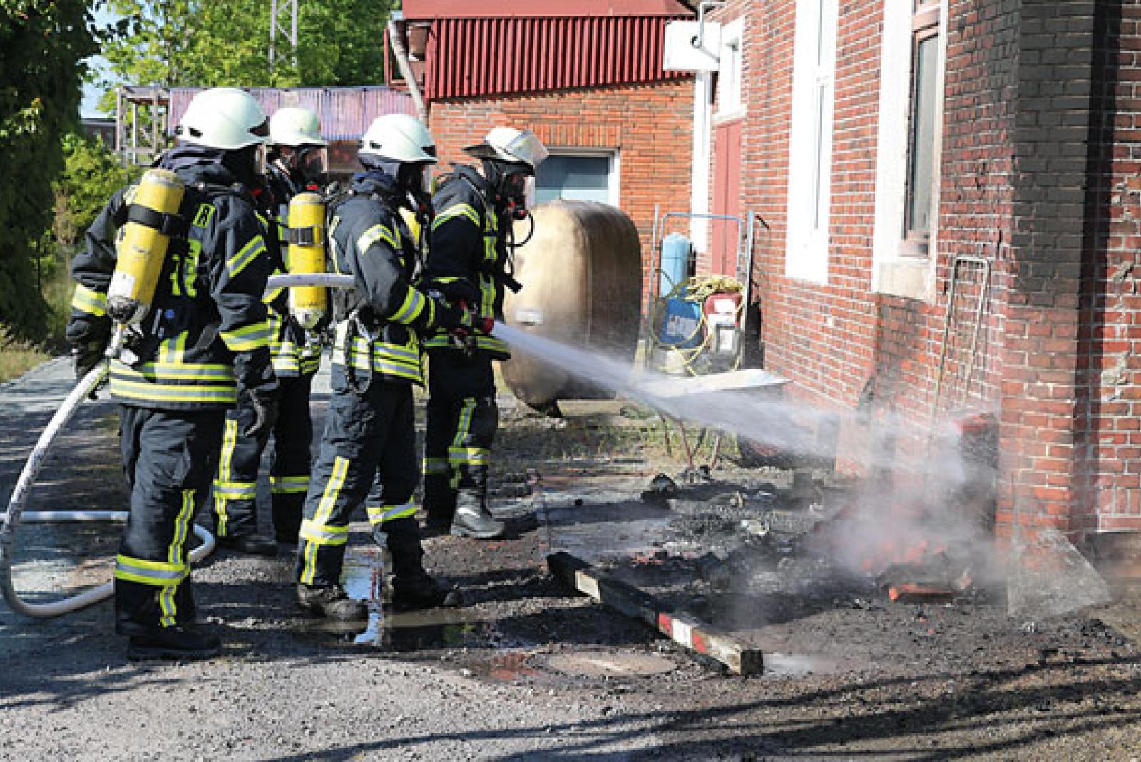 Vor Ort konnte Einsatzleiter Frank Harms schnell Entwarnung geben. Lediglich ein Müllcontainer stand beim Eintreffen der Wehren in Brand.