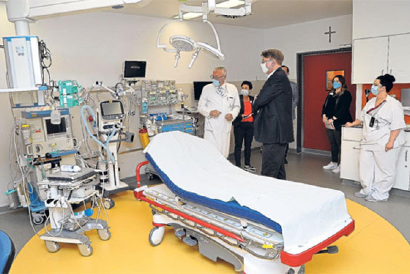 Stippvisite mit Mund-Nase-Schutz: Als Herzstück der neuen Zentralen Notaufnahme gilt der Schockraum, dessen Funktion Prof. Dr. Christian Wende (links) erläuterte. © Foto: Schade