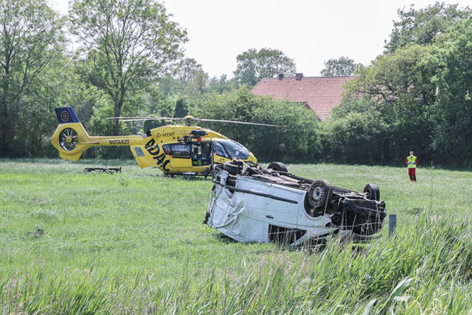 Durch den Zusammenstoß wurde der Mercedes zunächst gegen das Wohnwagengespann und schließlich auf eine angrenzende Weide geschleudert. Dort kam der Pkw auf dem Dach liegend zum Stillstand. Auch der Audi überschlug sich.