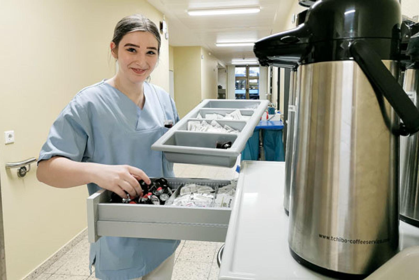 Draußen ist es noch dämmrig, doch die Flure auf der Wahlleistungsstation (Station 24) im Borromäus-Hospital in Leer sind hell. Stimmen dringen aus dem Dienstzimmer und Carolin Stumpe ist bereits im hellblauen Kasack unterwegs. Für die 18-Jährige ...