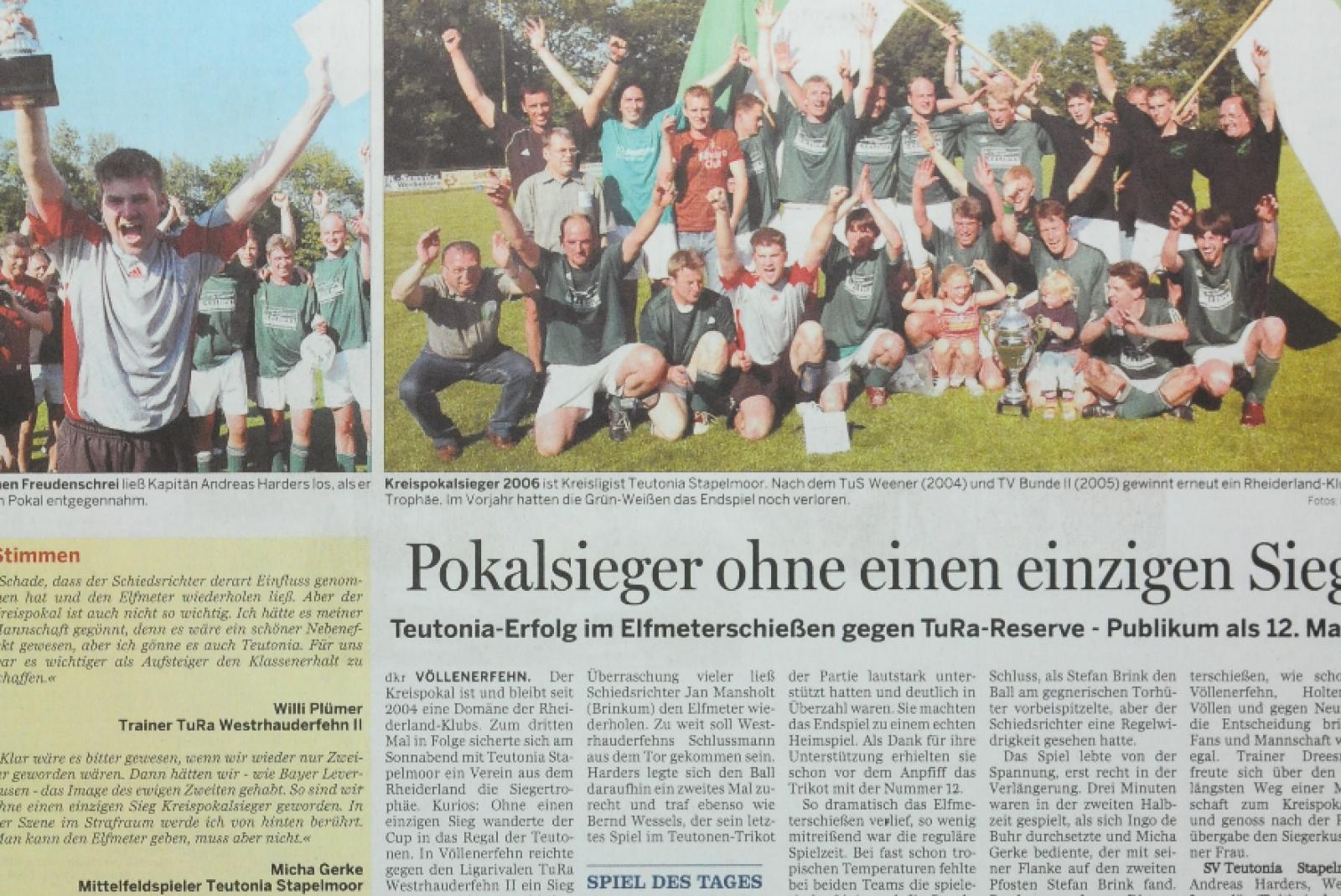 Am Sonnabend sind die Fußballer des SV Teutonia Stapelmoor beim Elfmeterschießen um den Kreispokal 2 in Großefehn dabei. Mit Entscheidungen vom Punkt hat die Mannschaft der Saison 2005/06 besonders gute Erfahrungen gemacht.